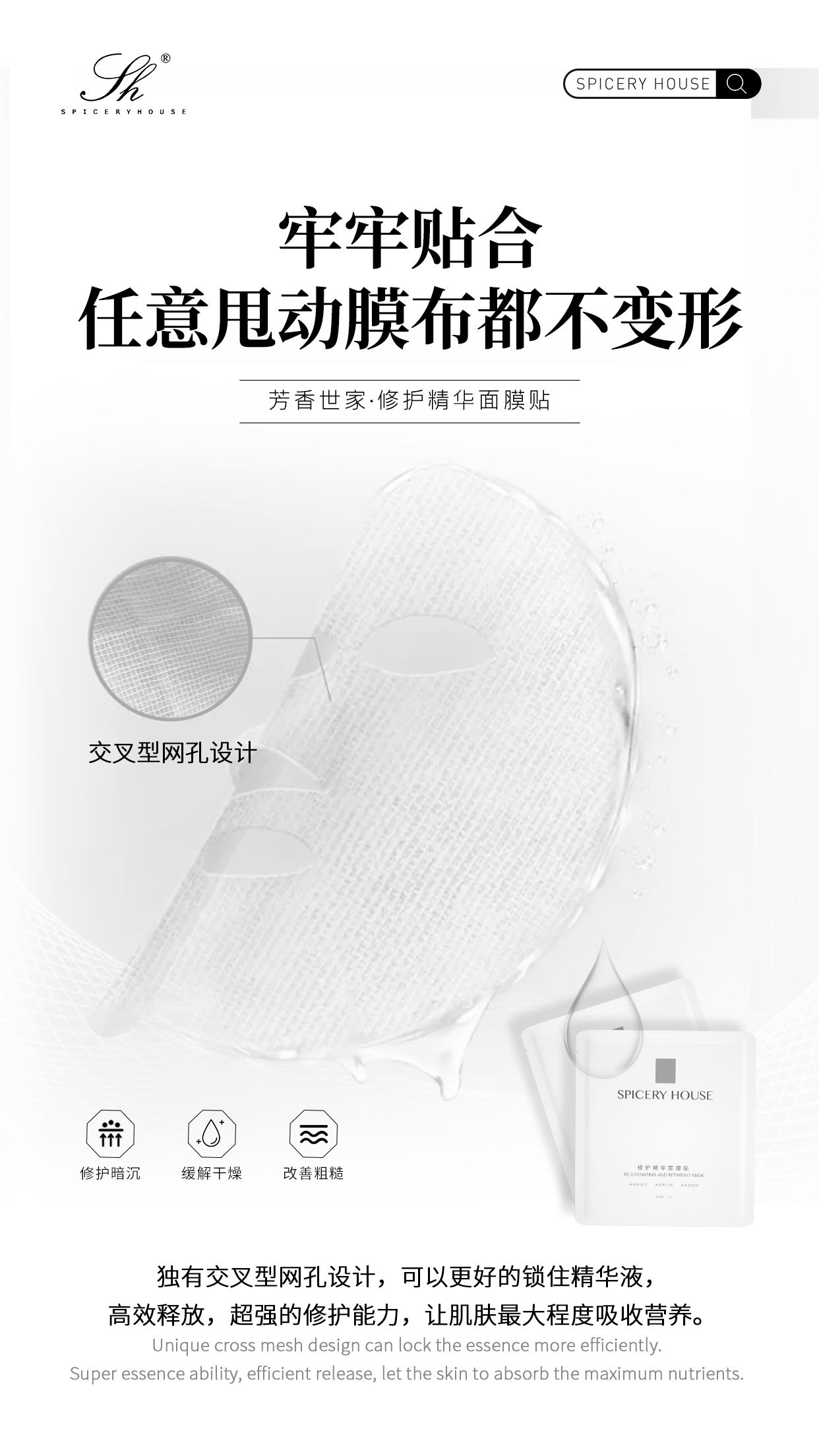 总之,芳香世家 spiceryhouse 芳香世家修护精华面膜贴 “牢牢贴合,任意甩动膜布都不变形” 的特点,不仅解决了传统面膜的敷贴痛点,还让修护护肤变得更自由、更便捷。它用匠心的材质与剪裁,为用户带来了 “敷面膜不用小心翼翼” 的舒适体验,同时搭配强大的屏障修护功效,让每一次敷贴都成为一次高效的肌肤呵护。无论你是居家放松、办公间隙还是需要应急修护,这款高贴合度的面膜贴都能满足你的需求,让受损肌肤在舒适便捷的体验中,重新找回健康水润的状态。