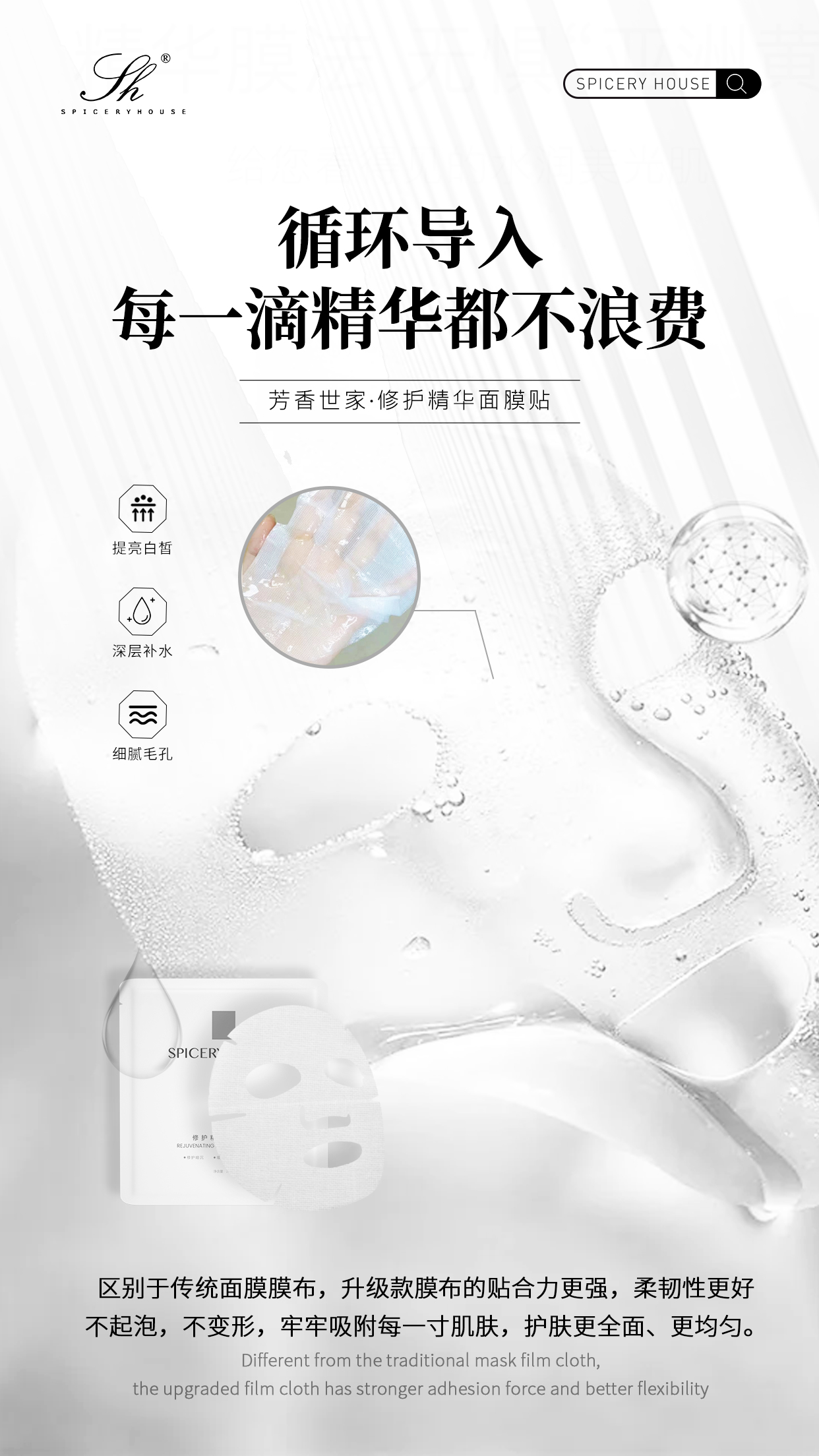 敷面膜时,你是否常遇到这样的遗憾:刚敷几分钟,膜布就变得干硬,剩下的精华只能倒在脸上随意涂抹,却难以被肌肤吸收;或是取下膜布后,袋中还残留大量精华,扔了可惜、用着又麻烦。这些问题的核心,在于面膜 “精华锁存” 与 “渗透导入” 的能力不足。而芳香世家 spiceryhouse 修护精华面膜贴,凭借 “循环导入” 的创新设计,从根源上解决了精华浪费的痛点,让每一滴精华都能精准作用于肌肤,真正实现 “精华不浪费,修护更高效”。