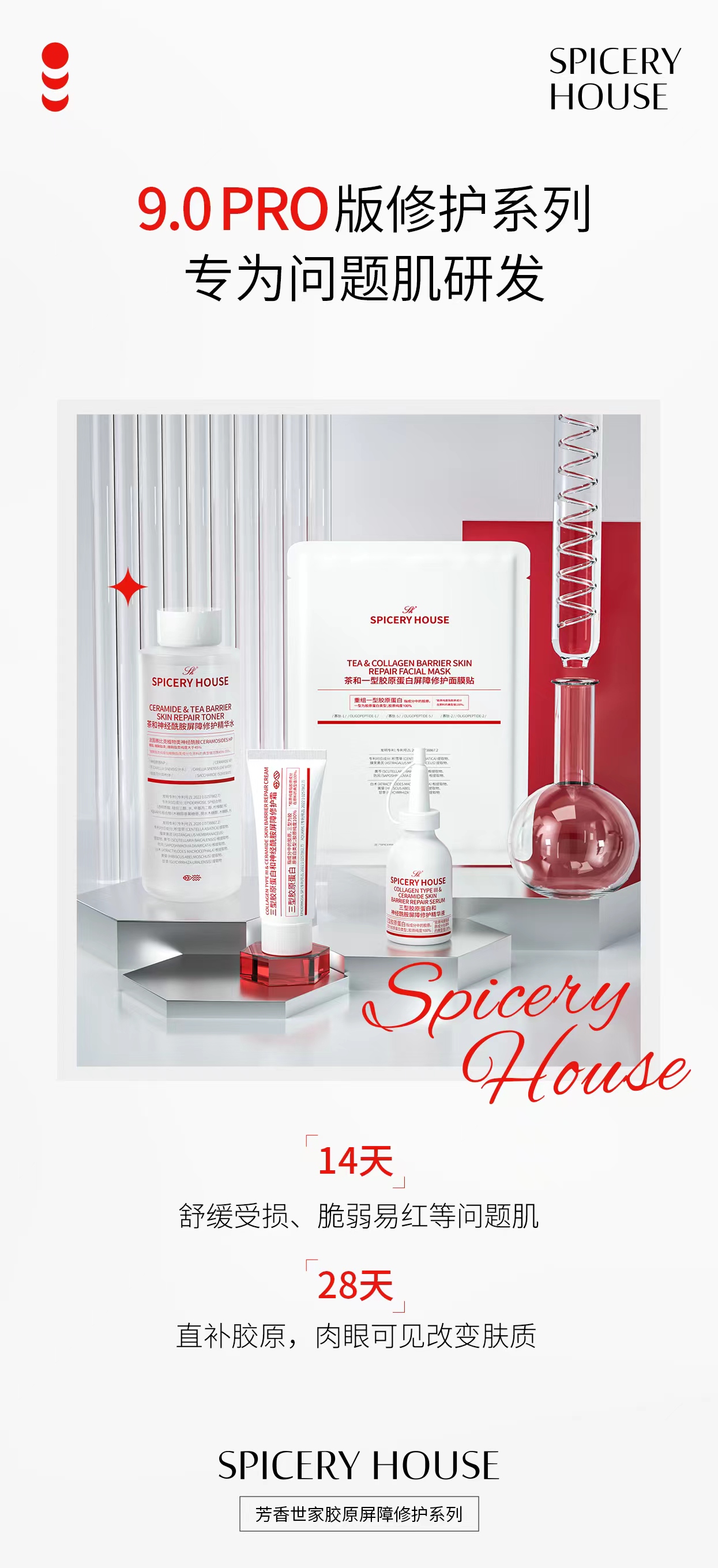 反复泛红的脸颊、遇刺激就刺痛的肌肤、医美术后迟迟不愈的屏障,还有熬夜后粗糙脱皮的状态,这些问题肌的“顽固困扰”,让无数人在护肤路上屡屡碰壁。普通修护产品要么只做表面舒缓,要么成分刺激加重负担,难以精准解决根源问题。芳香世家spiceryhouse深耕问题肌修护领域十余载,重磅推出9.0PRO版胶原屏障修护系列,以升级配方、精准功效和科学体系,为问题肌量身定制修护方案,让强韧好肌不再遥远。自2012年创立,芳香世家便以“专注问题肌科学修护”为使命,摒弃“一刀切”的护肤思路。依托十万级制药标准生产车间与国际联合研发中心的技术沉淀,品牌针对敏感肌、受损肌、医美术后肌等不同问题肌类型,历经上千次配方调试与皮肤耐受测试,最终打造出9.0PRO版修护系列。该系列延续品牌“简成分、高活性、强适配”的核心优势,更在胶原活性、成分协同性上实现突破,专为问题肌的“脆弱特质”而来。