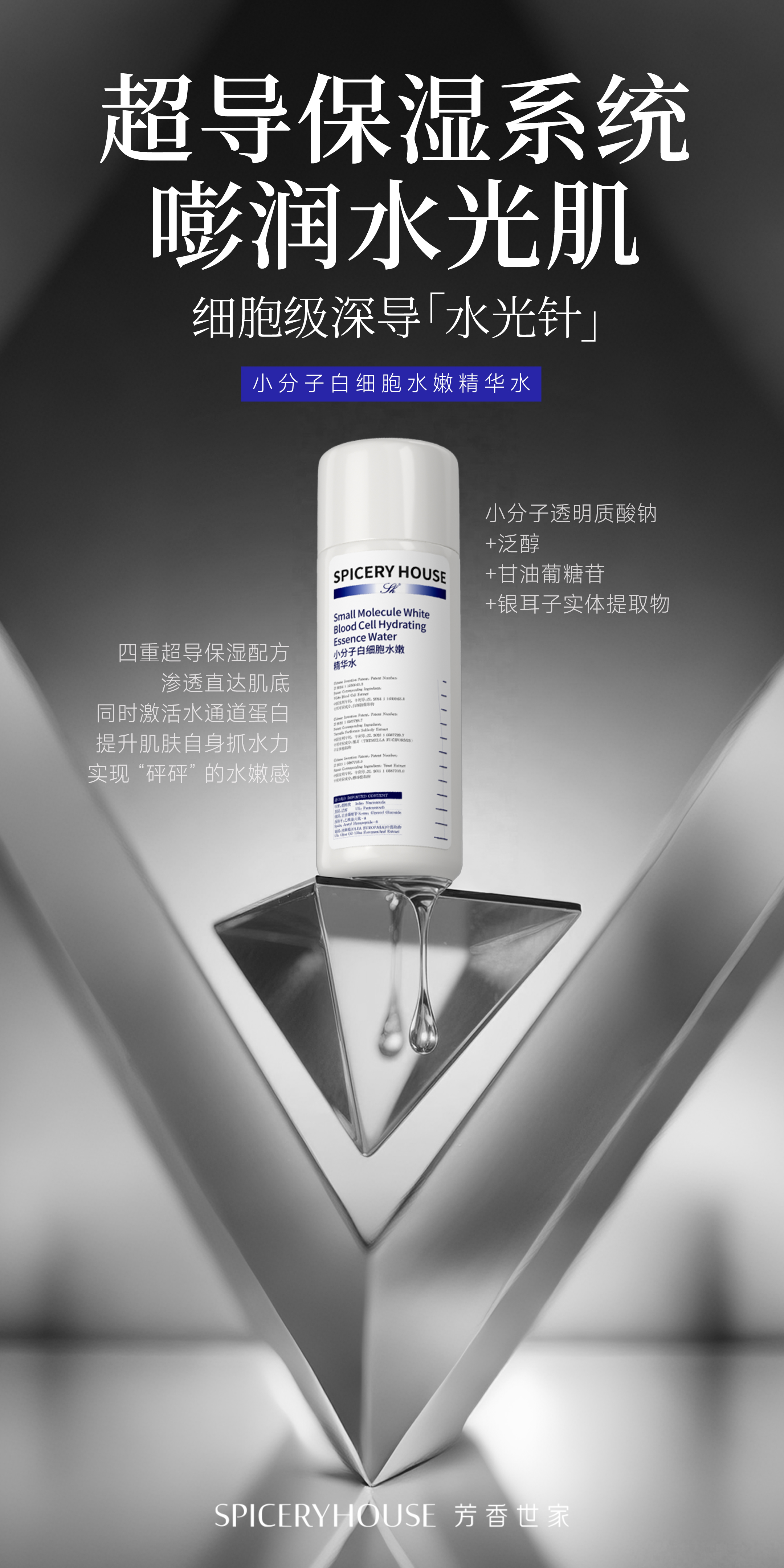 谁不渴望一张嘭润饱满、透着原生光泽的水光肌?可换季干燥起皮、熬夜后干瘪暗沉、外油内干卡粉等问题,总让肌肤陷入“补不进、锁不住”的保湿困境——普通精华水要么只做表面补水,敷完秒干;要么质地厚重,闷痘又搓泥。直到芳香世家SpiceryHouse小分子白细胞水嫩精华水的出现,以创新超导保湿系统为核心,搭配多重植萃与专利技术,实现“极速渗透+深层补水+长效锁水”三重突破,让每一次护肤都成为肌肤的“嘭润充电”,轻松养出弹嫩透亮的水光肌。作为创立于2012年的国妆实力品牌,芳香世家始终坚守“简”与“和”的核心护肤理念,摒弃酒精、香精等冗余刺激成分,专注以科学技术赋能天然植萃,直击肌肤缺水干瘪痛点。这款小分子白细胞水嫩精华水,正是品牌十余年科研沉淀的匠心之作,其核心亮点便是独创的超导保湿系统——打破传统保湿“表层徘徊”的局限,通过技术革新构建“渗透-补水-锁水”完整链路,重新定义“嘭润+水光”的护肤底层逻辑,让干皮、熬夜党、脆弱肌都能拥有安心的高效保湿方案。