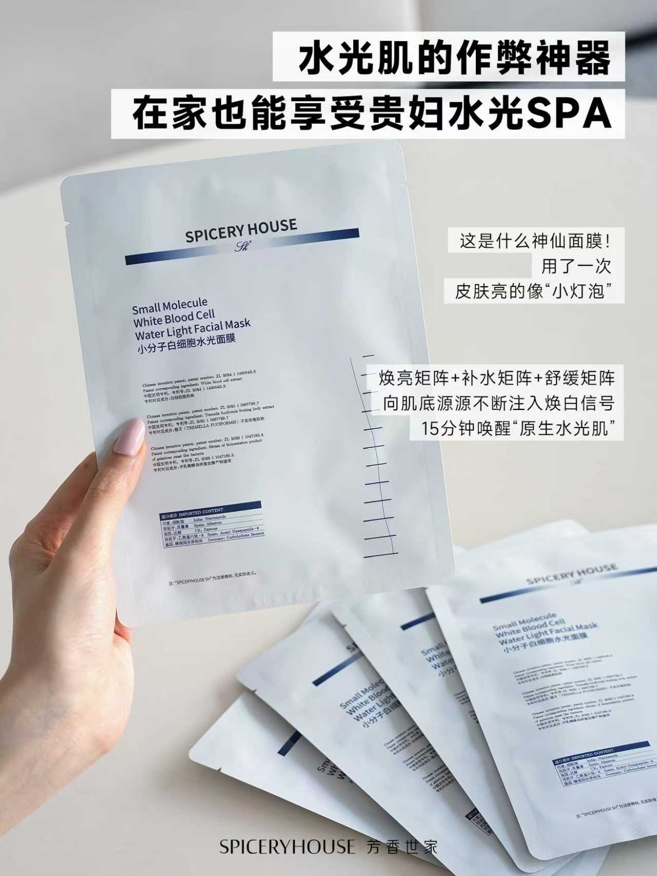 谁不想拥有一张自带柔光滤镜的水光肌?饱满弹润、通透莹亮,哪怕素颜也能透着健康光泽,轻松拿捏氛围感美感。但现实里,熬夜暗沉、干燥卡粉、屏障脆弱、肤色不均等问题,总让水光肌变成“遥不可及的奢望”——去美容院做一次贵妇水光SPA,动辄上千、耗时耗力,普通人难以长期坚持;而普通补水面膜,大多只停留在表层补水,难以渗透肌底,敷完转瞬即逝,根本达不到长效水光的效果。芳香世家Spicery House深耕科学养肤十余年,坚守“简”与“和”的核心理念,精准破解这一护肤痛点,推出小分子白细胞水光面膜,堪称“水光肌作弊神器”,不用奔波美容院,不用复杂护肤步骤,在家花15分钟,就能轻松享受堪比贵妇级的水光SPA,让每一位普通人都能低成本解锁原生水光肌。很多人对水光肌有个误区,认为“补水=水光”,盲目叠加补水面膜,却发现肌肤依旧干瘪无光、外油内干。其实,真正的水光肌,核心是“肌底充盈、水分锁留、屏障健康”,而普通面膜难以实现这一点,关键在于成分渗透力不足——大分子成分无法穿透肌肤角质层,只能在表层停留,无法真正滋养肌底,自然难以形成由内而外的水光质感。芳香世家小分子白细胞水光面膜,打破传统面膜的局限,以“小分子渗透+多维奢养”为核心,让每一滴精华都能直达肌底,从根源实现“补水-锁水-修护-焕亮”一步到位,这也是它能媲美贵妇水光SPA的核心底气,更是区别于普通补水面膜的关键所在。作为一款能实现“居家贵妇SPA”的面膜,芳香世家小分子白细胞水光面膜的核心优势,首先在于品牌专属的专利小分子渗透技术——这相当于为精华成分开辟了直达肌底的“快速通道”,从根源解决普通面膜“渗透难、效果浮于表面”的痛点。品牌通过专属技术,将面膜精华中的所有有效成分拆解为纳米级小分子,粒径仅为普通面膜成分的1/10,渗透效率提升3倍之多,能轻松穿透肌肤三道防护屏障,直达肌底细胞间隙,就像给肌底细胞“直接喂饱营养”,彻底终结“表层湿润、肌底缺水”的护肤假象,这也是贵妇水光SPA追求的“深层滋养”核心逻辑,在家就能轻松复刻。若说小分子技术是“输送载体”,那精准配比的多维配方,就是这款面膜实现“贵妇级奢护”的灵魂所在,其中核心成分小分子白细胞提取物,更是被誉为“肌底焕亮修护黄金成分”。
