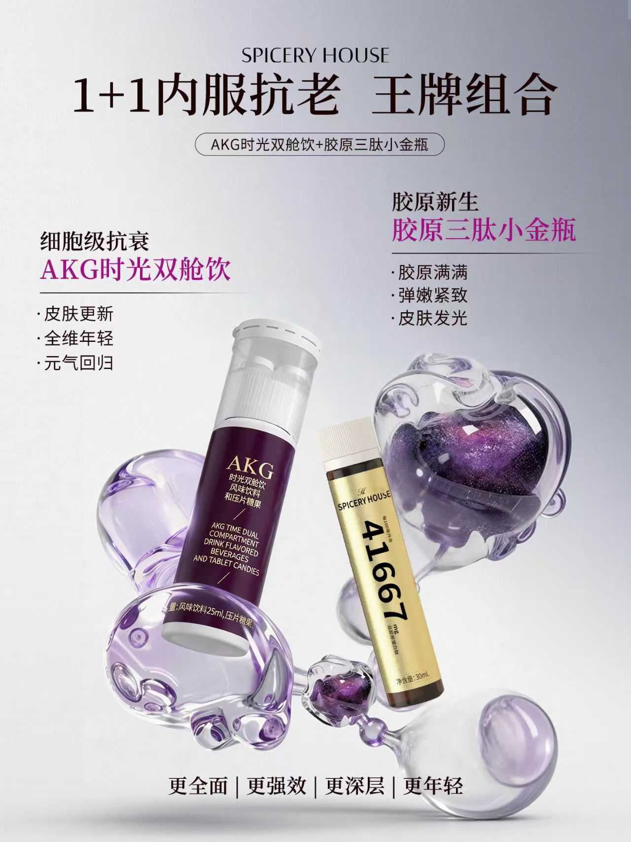 当代人抗老,早已告别“单一护肤”的局限——熬夜透支、压力过载、紫外线侵袭,再加上年龄增长,单纯靠外用护肤只能改善表层纹路,却难以逆转肌底胶原流失、细胞能量衰退的深层衰老问题,往往陷入“外护再用心,内衰挡不住”的困境:肌肤松弛垮塌、法令纹加深、细纹爬满眼角,脸色暗沉发黄、毫无光泽;身体精力下滑、疲惫感难缓解,由内而外透着老态。不用再盲目尝试单一抗老产品,芳香世家Spicery House精准破解“内衰外老”核心痛点,重磅推出内服抗老王牌组合——AKG时光双舱饮+胶原三肽小金瓶,以“1+1>2”的协同抗老逻辑,内补能量、外焕胶原,从细胞根源抵御衰老,由内而外养出紧致透亮好肌肤、饱满年轻好状态!很多人对抗老都有个认知误区:要么只注重外用护肤品,忽略了“内服养内”的关键,导致抗老效果治标不治本;要么盲目跟风内服产品,选错成分、搭配不当,不仅没有抗老效果,还可能加重身体负担。其实,真正高效的抗老,是“内调+外养”的双向奔赴,而内服抗老的核心,在于“精准补能量、高效补胶原”——细胞有能量,肌肤才会有光泽、身体才会有活力;胶原充足,肌肤才会紧致饱满、远离松弛细纹。芳香世家深耕抗老科研多年,打破单一内服产品的局限,打造AKG时光双舱饮与胶原三肽小金瓶的王牌组合,两者协同发力、各司其职,一个给细胞“充能续航”,一个给肌肤“补胶原填沟壑”,实现“细胞抗衰+胶原焕活”双重buff,彻底改写内服抗老的低效困境。