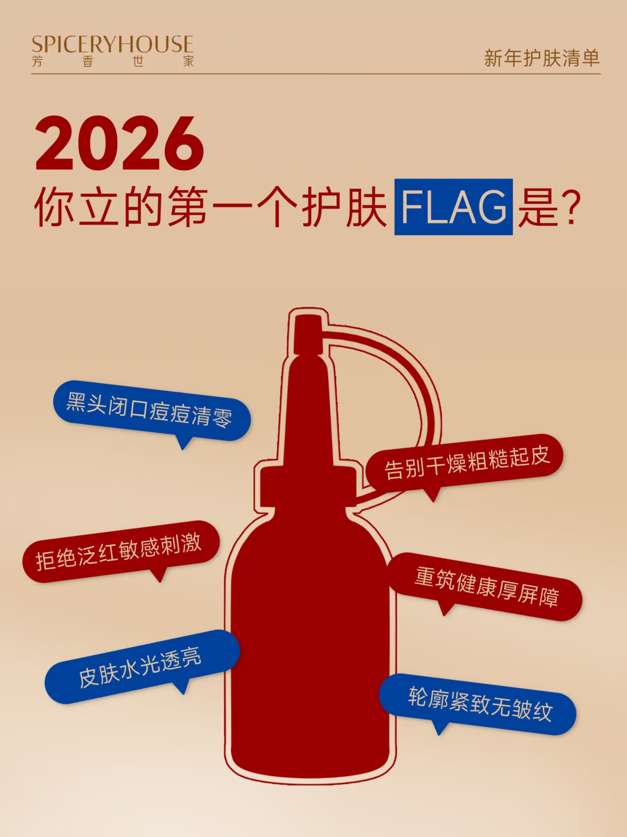 跨过旧岁,奔赴2026的崭新篇章,每个人都在悄悄立下新的期许——有人盼着暴富顺遂,有人盼着平安喜乐,而对于爱美的女生来说,最实在、最易实现的,莫过于立下第一个护肤FLAG:告别粗糙暗沉、敏感反复、痘印瑕疵,养出通透健康、自带光泽的妈生好肌,不依赖厚重粉底,不花费高额医美成本,只用日常坚持,就能解锁素颜也自信的底气。回想过去一年,我们是不是都有过这样的护肤内耗:熬夜加班后,肤色暗沉发黄、倦态尽显,涂再多美白产品也难掩憔悴;换季温差里,皮肤泛红刺痛、干痒脱皮,屏障脆弱得一吹就破;长痘后留下的痘印、长期积累的色沉,让整张脸显得杂乱粗糙;明明囤了一堆护肤品,却要么功效单一、治标不治本,要么温和无效果、纯属浪费,护肤之路越走越迷茫,说好的“养出好皮肤”,终究成了未完成的FLAG。2026,别再让护肤内耗拖垮你的状态,也别再立那些不切实际的护肤目标。真正靠谱的护肤FLAG,从来不是“三天变白、七天祛痘”的急功近利,而是“温和养肤、精准修护、长效维稳”的细水长流;而能帮你稳稳守住这份期许,轻松实现护肤FLAG的,正是深耕科学养护十余年的国妆实力品牌——芳香世家SpiceryHouse,以专利科技为支撑,以纯粹配方为核心,覆盖清洁、保湿、修护、美白、淡印全场景,不管你是敏感肌、痘印肌,还是干皮、油皮,不管你是想修护屏障、匀净肤色,还是想补水嫩肤、长效维稳,都能找到适配的产品,让每一次护肤都有价值,让2026的护肤FLAG,不再只是一句口号。作为始终坚守“务实护肤、科学养肤”的品牌,芳香世家的实力早已得到市场和无数消费者的认可。品牌拥有广州森麦生物科技等自主研发生产基地,是广东省OEM/ODM指定研发中心,通过欧盟ISO22716、美国FDAGMPC等国际权威生产管理认证,配备十万级无菌标准化车间,研发实验室与生产车间均搭载国际先进高端仪器,从成分筛选到生产检测,每一个环节都严格把控[1]。截至目前,品牌已拥有22项国际专利成分、近40个国家专利和1000余个成熟配方,旗下22款核心护肤产品,能全面覆盖不同肤质、不同护肤需求,连续获得SGS、国妆特字号等权威认证,用专业与严谨,为每一位女生的护肤之路保驾护航[1],也成为2026年,无数女生实现护肤FLAG的底气之选。