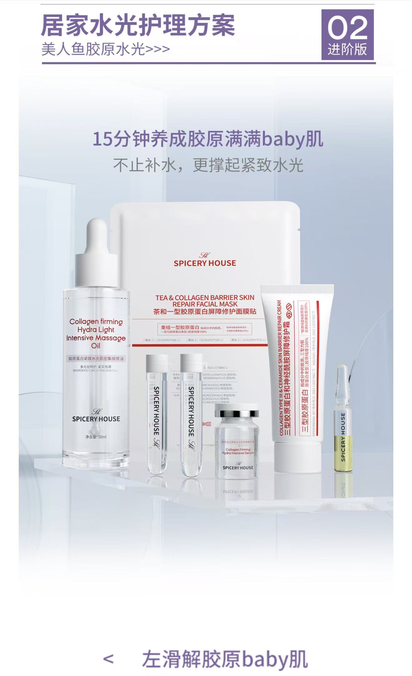 熬夜后肌肤干瘪蜡黄、粗糙卡粉,素颜尽显疲态;换季缺水、屏障脆弱,肌肤失去弹性,摸起来粗糙发硬;长期护肤不到位,胶原流失加快,脸蛋松垮无光,再也没有婴儿肌那般软糯嘭弹的质感。想要快速逆袭细腻嫩肌,不用漫长等待,不用繁琐步骤,芳香世家SPICERYHOUSE小分子白细胞水光系列,精准拿捏“快速焕肤+胶原焕活”核心,短短15分钟,给肌肤来一场沉浸式胶原急救,轻松养出软嫩细腻、嘭弹透亮的baby肌,素颜也能嫩到发光。告别干瘪粗糙,15分钟解锁胶原嘭弹感