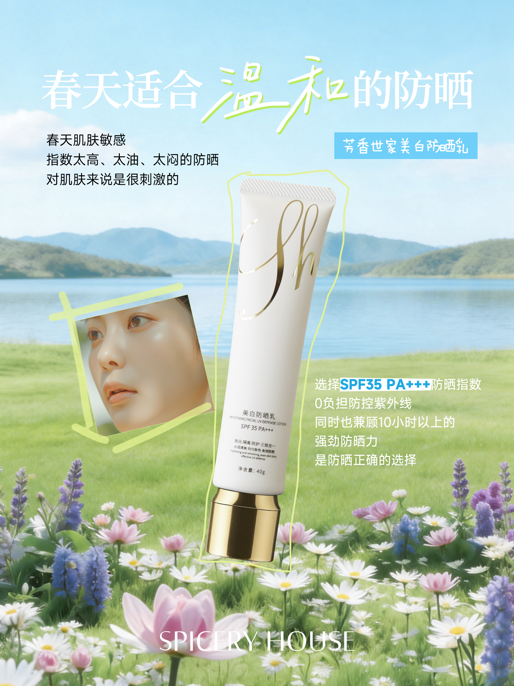 春风渐暖,阳光褪去冬日的凛冽,变得温柔却暗藏“杀机”。很多人误以为春天太阳不烈,无需认真防晒,却不知春季紫外线中的UVA穿透力极强,堪比夏季,加上此时肌肤屏障刚从寒冬的干燥中恢复,脆弱敏感,易受花粉、粉尘刺激,稍不注意不仅会被晒黑、晒老,还可能引发泛红、刺痛、干痒等敏感问题。春季护肤的核心的是“温和守护”,防晒更是如此——既要能有效抵御紫外线伤害,又要足够温和,不刺激脆弱肌、不加重肌肤负担,而芳香世家spiceryhouse美白防晒乳,恰好契合了这份春日护肤期待,成为春日肌肤的“温和防护盾”,兼顾防护与养肤,守护每一寸脆弱肌肤。春日护肤的痛点,莫过于“防护需求”与“肌肤脆弱”的矛盾:普通高倍防晒多厚重黏腻,易堵塞毛孔、刺激肌肤,加重敏感;过于温和的防晒又往往防护力不足,无法抵御春季紫外线的隐性伤害。芳香世家这款美白防晒乳,从“温和兼顾防护”出发,彻底打破传统防晒“温和则弱效、强效则刺激”的壁垒,打造出适配春日脆弱肌的温和肤感。它采用独特的微囊包裹技术与“油包水”乳化工艺,质地如同水润乳液,流动性极强,推开时轻盈顺滑,毫无黏腻感,仿佛是在涂抹一款温和的修护精华,上脸30秒就能快速成膜,薄如蝉翼的防护膜透气不闷肤,不会堵塞毛孔,同时能为肌肤补充水分,缓解春日干燥紧绷,让肌肤在温和防护中保持水润通透,敏感肌上脸也无负担。更难得的是,这款防晒的温和感,丝毫没有牺牲防护力。