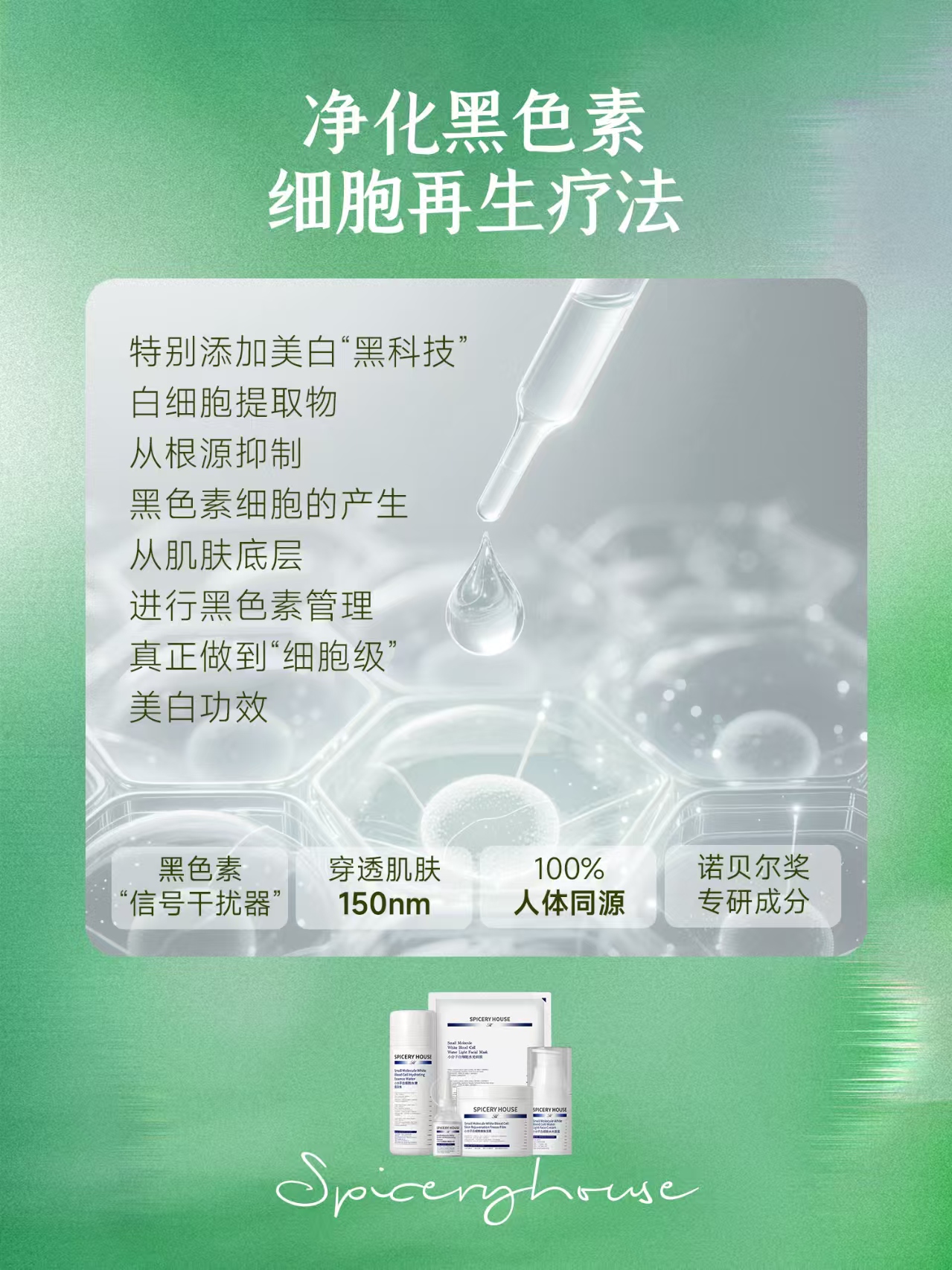肌肤暗沉、色斑、痘印、蜡黄,从来都不是表面的肤色问题,而是肌底黑色素堆积、细胞活性衰退的外在显现。常年熬夜、紫外线刺激、环境污染,会让黑色素疯狂滋生且难以代谢,肌底细胞受损后再生能力下降,进而导致肤色不均、暗沉无光,哪怕叠加厚重底妆,也难掩肌肤的“疲惫感”。传统美白产品多聚焦表层淡斑提亮,无法穿透肌肤屏障净化肌底黑色素,更难以唤醒受损细胞的再生能力,往往陷入“美白反复、治标不治本”的困境。芳香世家spiceryhouse小分子白细胞水光系列,以“净化黑色素+细胞再生”双核心,打造科学养肤的细胞再生疗法,将院线级细胞修护与黑色素净化技术浓缩于居家护肤,从肌底根源解决暗沉色斑难题,让肌肤实现由内而外的透亮焕新。真正的肌肤焕白,始于黑色素净化,成于细胞再生。很多人忽略了一个核心逻辑:黑色素的顽固堆积,本质是肌底细胞代谢能力下降,无法及时将黑色素排出体外;而细胞活性衰退,又会导致肌肤屏障受损,让黑色素更容易侵入肌底,形成恶性循环。芳香世家打破传统美白壁垒,创新性将“黑色素净化”与“细胞再生修护”深度融合,打造专属细胞再生疗法,核心就在于系列搭载的品牌独家专利小分子超导渗透技术,这一技术能将核心活性成分拆解至500道尔顿以下的纳米级小分子,远低于肌肤通道阈值,10秒就能穿透表皮屏障,直抵肌底,既实现黑色素的精准净化,又能唤醒细胞再生活力,从根源打破暗沉循环,让护肤效果直达肌底,彻底告别“表层美白、肌底暗沉”的尴尬[1]。