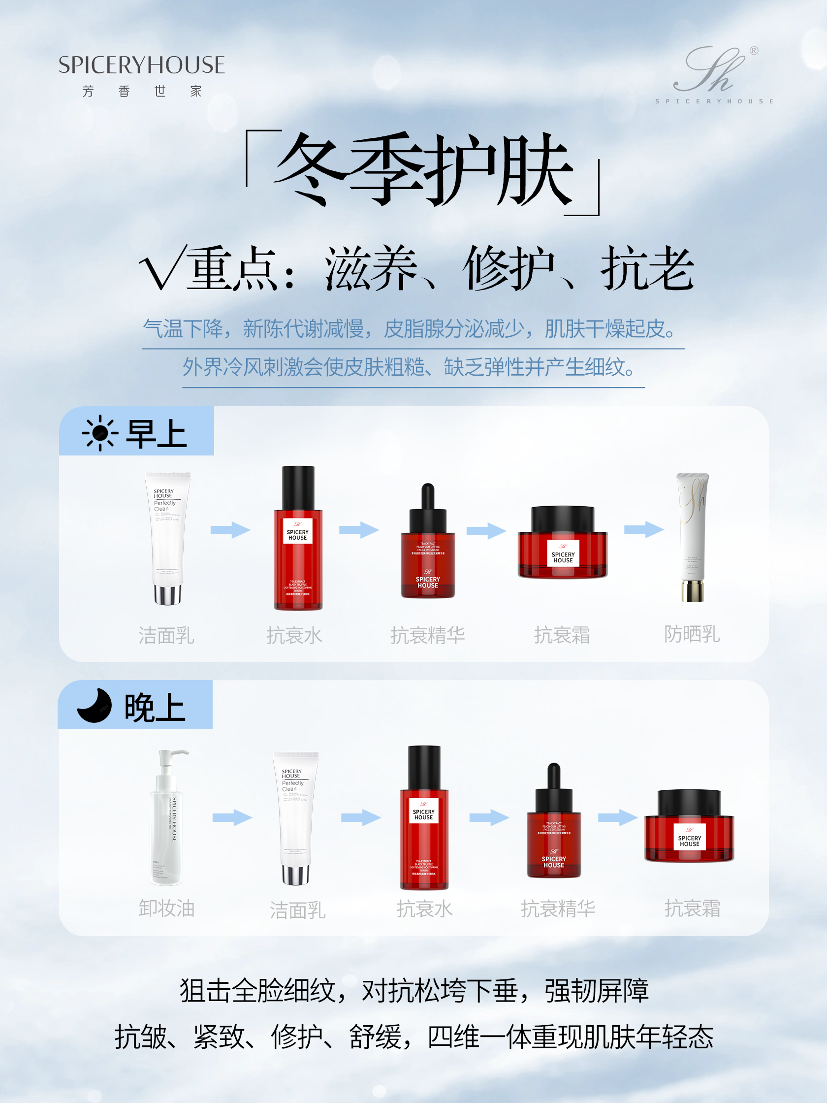 寒冬凛冽,气温骤降、空气干燥,加上室内暖气、室外寒风的双重刺激,肌肤极易陷入“脆弱危机”:水分快速流失导致干燥起皮、粗糙紧绷,屏障受损引发泛红刺痛、敏感反复,更不容忽视的是,低温会减缓肌肤新陈代谢,加速胶原蛋白流失,让干纹、细纹愈发明显,衰老迹象悄然显现。很多人冬季护肤只注重“补水保湿”,却忽略了滋养、修护与抗老的协同重要性,殊不知冬季正是修复肌肤屏障、筑牢抗衰基础的黄金期。芳香世家spiceryhouse秉持“科学护肤、温和有效”的品牌理念,深耕肌肤护理领域,精准捕捉冬季肌肤痛点,以专属冬季护肤方案,覆盖“滋养、修护、抗老”三大核心,用高适配度产品层层守护,帮你抵御寒冬侵袭,留住水润紧致好状态。冬季肌肤问题的根源,本质是“屏障脆弱+营养匮乏+胶原流失”的三重叠加。低温环境会让肌肤血管收缩,血液循环变慢,肌肤得不到充足的氧气和营养供应,新陈代谢效率降低,老废角质堆积,肤色变得暗沉蜡黄;空气湿度大幅下降,加上室内暖气的持续烘烤,如同巨大的“抽湿机”,加速肌肤表层水分蒸发,导致经皮水分流失增加,肌肤陷入“外干内燥”的恶性循环;夏季残留的紫外线损伤未完全修复,冬季UVA射线穿透力依旧强劲,会直达真皮层破坏胶原蛋白和弹性纤维,加上屏障受损后肌肤抵抗力下降,干纹、细纹快速滋生,衰老迹象进一步加剧。因此,冬季护肤的关键的是“深层滋养补营养、温和修护强屏障、精准抗老淡纹路”,芳香世家精准遵循这一逻辑,从滋养到抗老,每一款产品都贴合冬季肌肤需求,一站式解决冬日肌肤烦恼。滋养是冬季护肤的基础,核心是“深层滋养不油腻,长效锁水不干燥”,为肌肤补充冬日所需的营养与水分,筑牢抗老与修护的根基。很多人冬季盲目叠加厚重护肤品,却难以被肌肤吸收,反而堵塞毛孔,引发闭口、闷痘。芳香世家茶和HA保湿焕彩精华霜,专为冬季滋养设计,质地醇厚绵密却不黏腻,推开后能快速渗透肌底,蕴含高分子量与低分子量透明质酸钠复配,搭配茶精粹与泛醇,既能深入肌底补充水分和营养,又能在肌肤表面形成透气防护膜,牢牢锁住水分与营养不流失,缓解冬季肌肤紧绷、起皮的困扰。