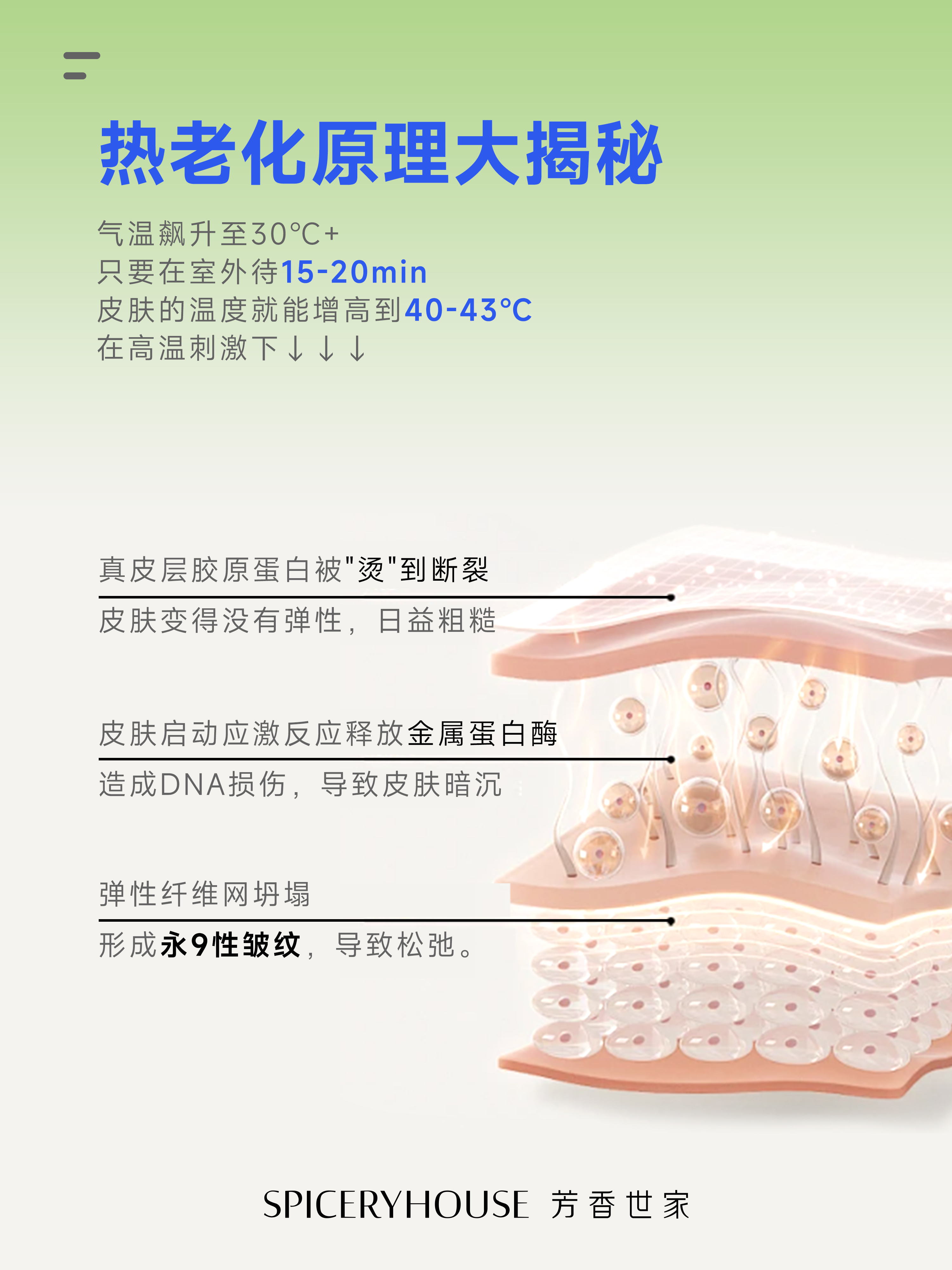 很多人都知道紫外线会导致光老化,却忽略了一个隐形的肌肤杀手——热老化。所谓热老化,英文名“Thermal Aging”,指皮肤在长期或反复暴露于热源刺激下,出现的一系列加速衰老现象,它不像晒伤那样立竿见影,却如同文火慢炖般,悄悄瓦解肌肤的年轻根基,尤其在夏季高温、秋冬暖气、日常高温电器使用等场景中,热老化正以肉眼不可见的速度,损伤我们的肌肤。芳香世家spiceryhouse秉持“科学护肤、温和有效”的品牌理念,深耕肌肤抗衰领域,精准拆解热老化的核心原理与损伤痛点,以针对性产品体系,从根源抵御热老化侵袭,帮你守住肌肤紧致透亮的年轻状态,解锁科学抗衰新方式。要抵御热老化,首先要读懂它的核心原理——热老化的本质,是“热源刺激引发的胶原损伤+炎症反应+屏障脆弱”的恶性循环,而非单纯的“高温晒黑”。我们日常接触的热源无处不在,最主要的是阳光中的红外线(占到达地面太阳能的50%以上),其穿透力极强,可直达真皮层甚至皮下组织,与肌肤组织分子相互作用产生热量,直接损伤胶原蛋白和弹性纤维;除此之外,夏季室外热浪、室内空调与暖气的温差刺激、高温瑜伽、厨房灶台热辐射,甚至频繁用热水洗脸、长时间使用高温档吹风机,都会成为热老化的“加速器”。