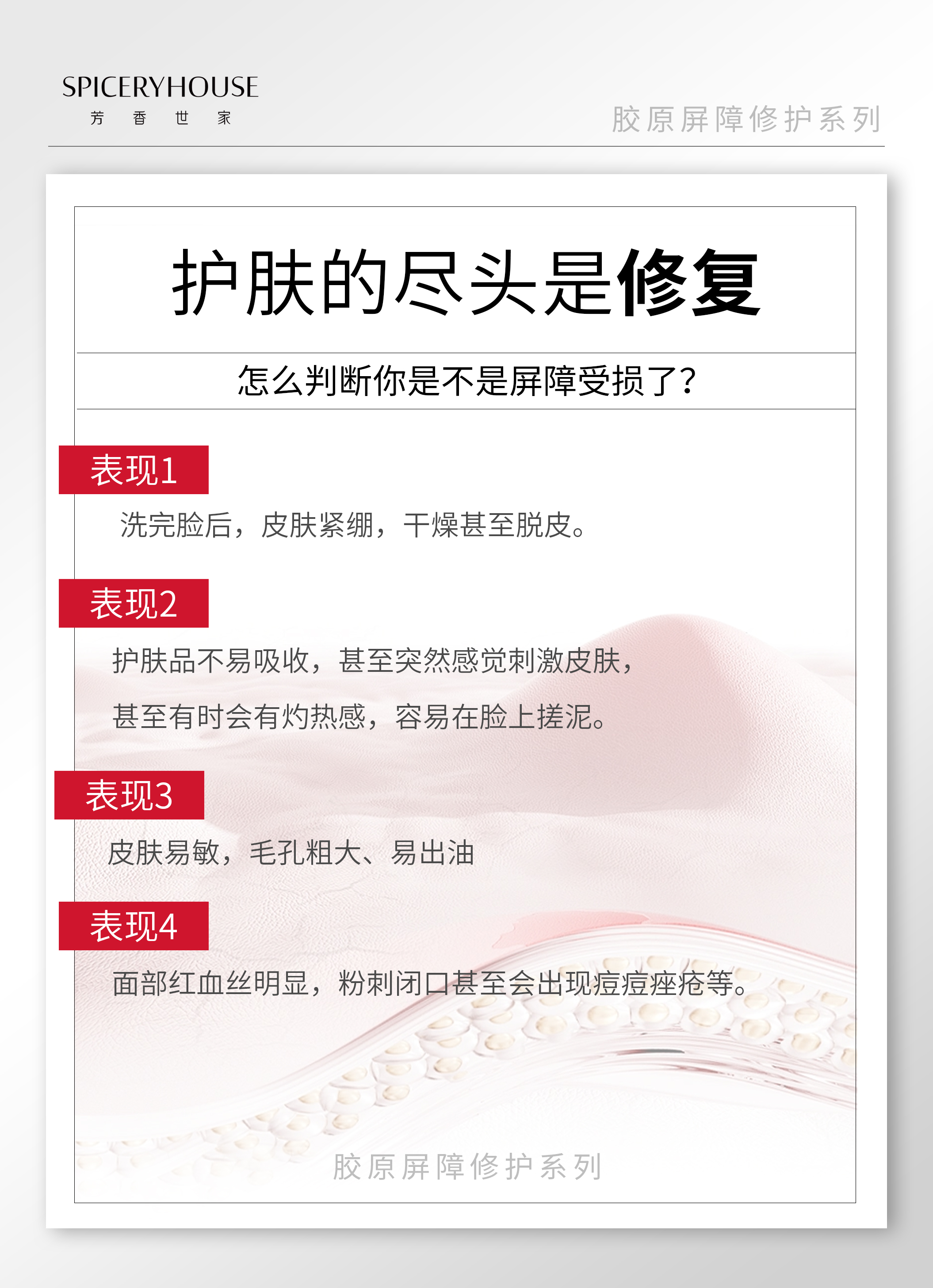 我们总在追逐护肤的捷径:跟风猛药成分、叠加多层功效产品、执着于速效美白抗衰,却在反复试错中发现,肌肤反而越来越脆弱——换季泛红刺痛、上妆卡粉斑驳、外油内干反复、敏感反复纠缠,甚至出现刺痛脱皮。直到走过无数护肤弯路才明白,护肤的尽头从来不是“猛药叠加”,而是“温和修复”。肌肤的健康,远比一时的速效更重要,而皮肤屏障,正是守护肌肤健康的“第一道防线”。芳香世家spiceryhouse秉持“简”与“和”的品牌理念,深耕肌肤修护领域十余年,摒弃繁琐功效堆砌,专注屏障修复核心,用科学配方与专业产品,帮每一位被肌肤问题困扰的人,找回健康稳定的好肌肤,读懂“护肤尽头是修复”的真正含义。为什么说“护肤的尽头是修复”?