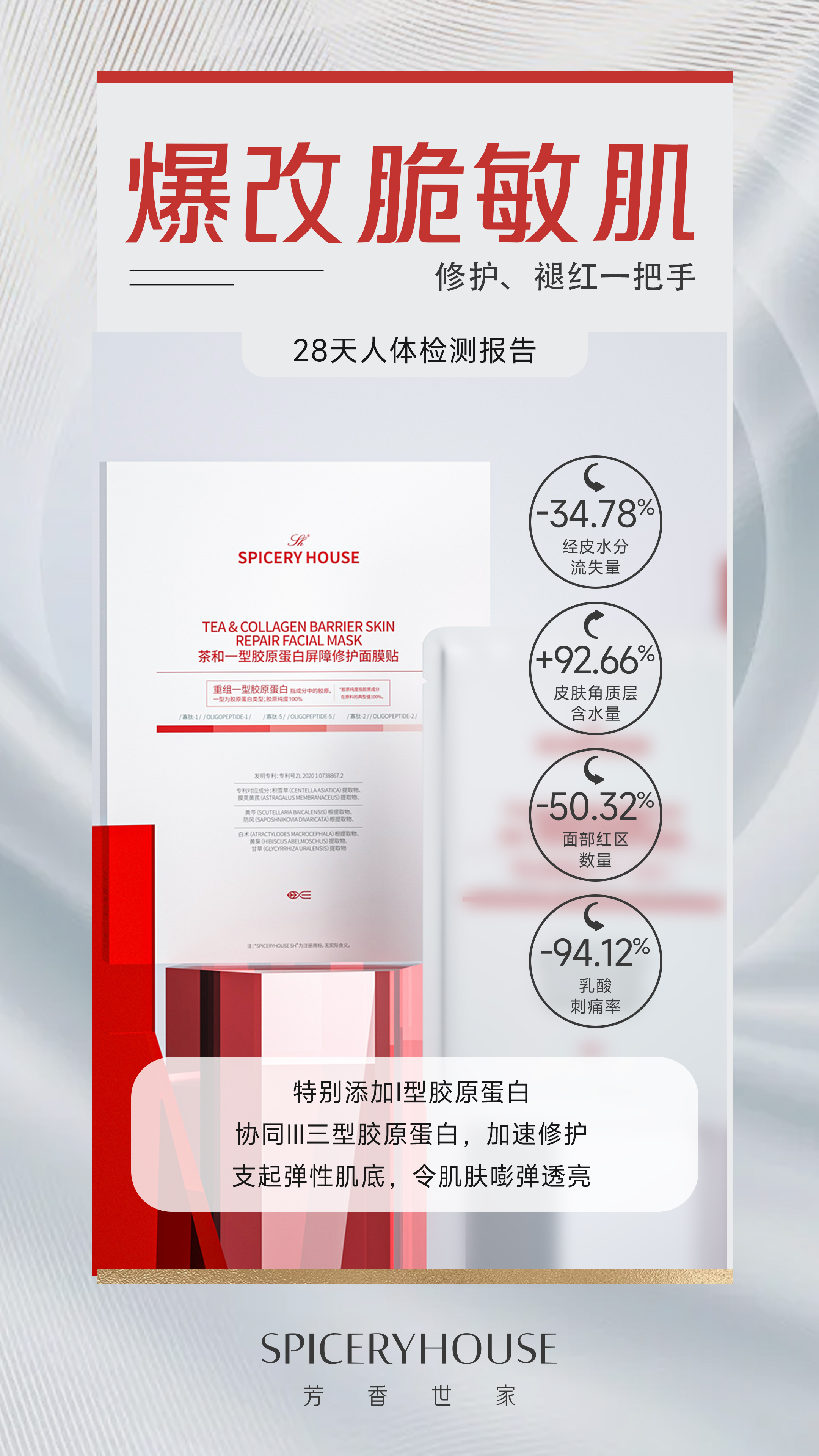 脆敏肌的困扰,从来都是“反复无常”——前一天还好好的肌肤,可能因为一次换季、一次熬夜、甚至一次轻微刺激,就瞬间泛红刺痛、干痒脱皮;屏障受损的肌肤,锁不住水分、挡不住外界侵袭,哪怕坚持基础修护,也难逃出“越护越脆、敏感反复”的怪圈。很多脆敏星人尝试过各种修护面膜,要么只做表面补水,敷完短暂水润后依旧干敏;要么成分刺激,敷完反而加重泛红刺痛,陷入“修护无效”的内耗。芳香世家spiceryhouse深耕脆敏肌修护领域十余年,延续“科学修护、精准赋能”的核心理念,重磅推出茶和一型胶原蛋白屏障修护面膜贴,以“一型胶原强支撑+茶萃舒缓稳屏障”双核心,精准破解脆敏肌反复难题,用敷贴式修护,手把手教你爆改脆敏肌,摆脱干敏困扰,养出水润强韧好肤质。脆敏肌的核心痛点,始终是“屏障受损+胶原流失+炎症反复”,三者相互影响、恶性循环。肌肤屏障就像一道“保护墙”,角质细胞是“砖块”,脂质是“灰浆”,而胶原蛋白则是支撑这道墙的“钢筋”,其中一型胶原蛋白作为肌肤中含量最高的胶原类型,占比高达80%以上,是维持肌肤屏障强韧、提升肌肤韧性的核心[2][3]。长期过度清洁、不当护肤、紫外线刺激,或是换季温差、压力熬夜等,都会导致一型胶原蛋白大量流失、屏障脂质减少,让“保护墙”千疮百孔——角质层变薄、锁水能力骤降,外界的花粉、尘螨、刺激成分轻易入侵,进而引发炎症反应,出现泛红、干痒、刺痛等脆敏症状[2][3]。很多人误以为“敷面膜补水”就能解决,却忽略了关键:只有同时补充一型胶原蛋白、舒缓炎症、填补屏障漏洞,才能实现长效修护,这也是芳香世家这款面膜贴的核心修护逻辑。