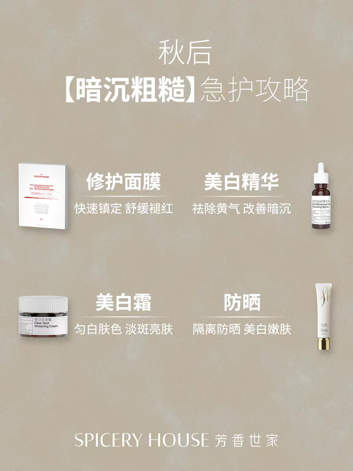 换季温差骤变、熬夜作息紊乱、紫外线隐形伤害……这些日常“刺客”总能轻易突破肌肤防线,让屏障受损的问题突然爆发。泛红刺痛、干燥脱屑、暗沉粗糙接踵而至,原本稳定的肌肤状态一夜“破防”。别慌,芳香世家spiceryhouse专为危“肌”时刻打造的急救组合,用修护面膜、美白精华、美白霜与防晒产品构建完整防护网,快速帮你稳住肌肤阵脚,重焕健康透亮。