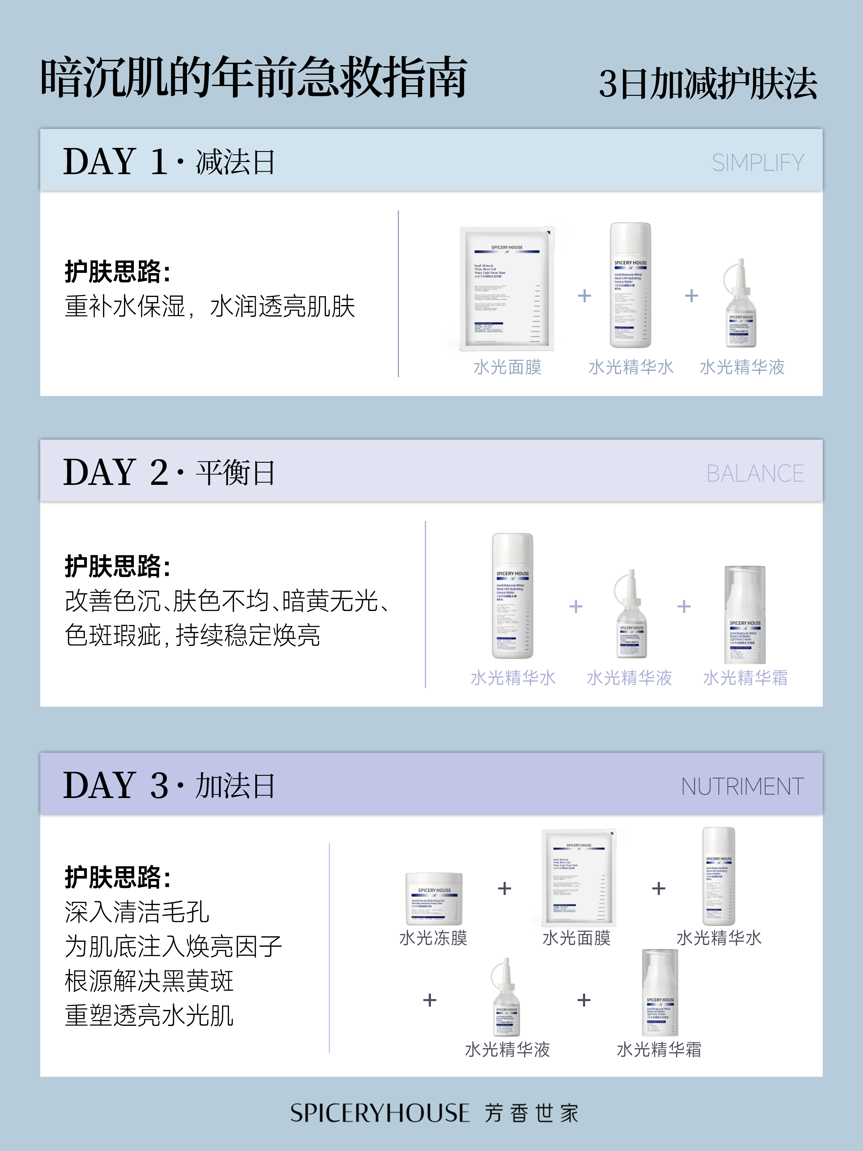 距离过年只剩短短几天,熬夜赶工、聚会应酬、冬季干燥叠加紫外线残留,让很多人的肌肤陷入“暗沉危机”——肤色蜡黄不均、毛孔粗大泛油、倦容难掩,哪怕叠涂几层底妆,也挡不住由内而外的疲惫感。想要在年前快速逆袭,摆脱暗沉、重拾透亮好气色,无需盲目叠加猛药护肤,芳香世家Spicery House深耕科学养肤十余年,遵循“简”与“和”的核心理念,推出暗沉肌专属3天急救流程,以DAY1减法日、DAY2平衡日、DAY3加法日的循序渐进模式,先清后养、分层赋能,不损伤肌肤屏障,快速唤醒肌底活力,让你3天告别暗沉黄气,以通透紧致的好状态,从容应对过年各种场合。
