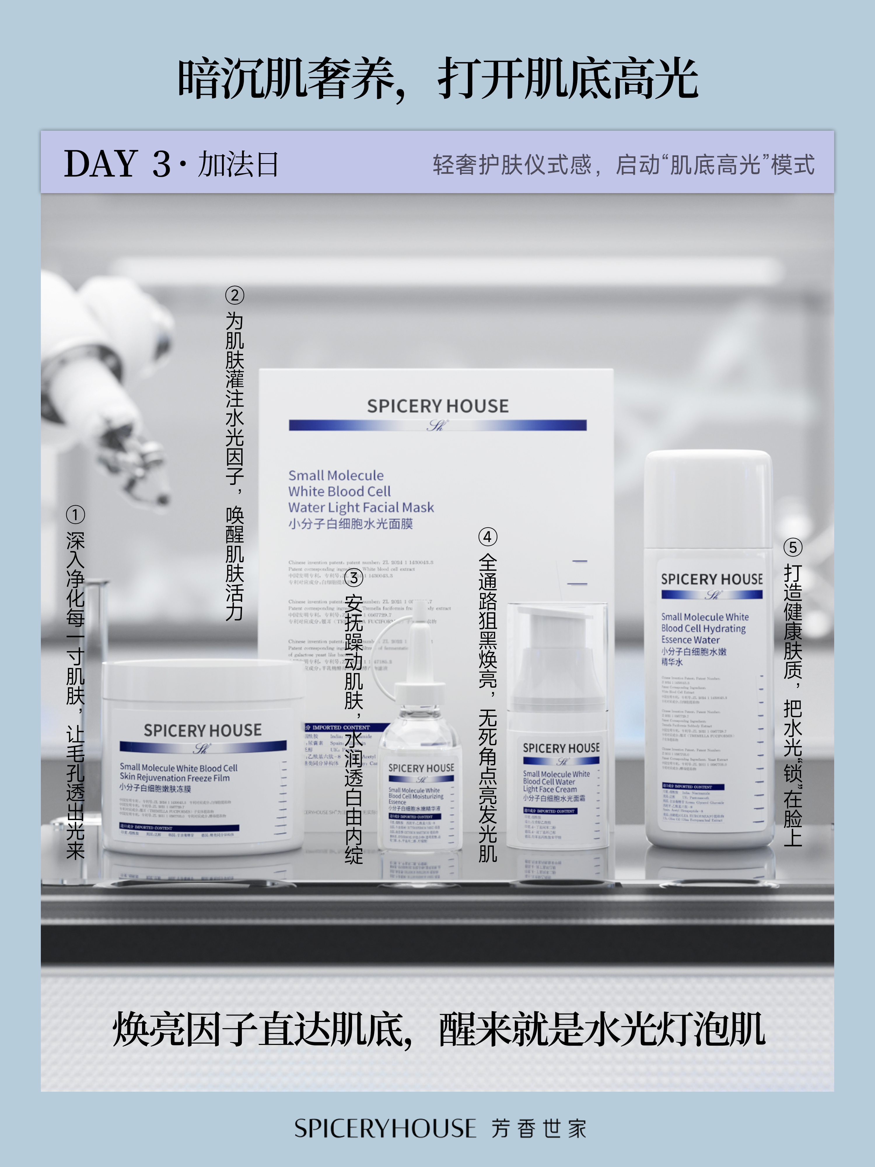 年关将至,熬夜赶工、聚会应酬连轴转,再加上冬季干燥缺水、紫外线隐性损伤,很多人的肌肤逐渐陷入“暗沉困局”——肤色蜡黄不均、肌底干瘪无光,眼角还藏着细碎干纹,哪怕叠涂多层粉底,也难掩由内而外的疲惫感,自带“假面感”,与节日该有的通透好气色格格不入。其实,暗沉肌的核心痛点从不是表层“遮黄”,而是肌底营养匮乏、代谢迟缓,唯有精准奢养、深层焕活,才能打破暗沉循环。芳香世家Spicery House深耕科学养肤十余年,遵循“简”与“和”的核心理念,以“奢养不厚重、高效不刺激”为原则,甄选全球优质奢养原料,将DAY3加法日打造成暗沉肌专属奢养利器,以“深层滋养+焕亮肌底+抗衰修护”三重赋能,为暗沉肌注入满满营养,帮你打开肌底原生高光,轻松拥有通透莹润的节日好气色。