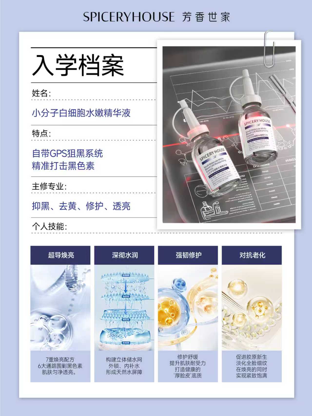 谁不曾为肤色暗沉、色斑横生而烦恼?紫外线照射、熬夜压力、屏障受损,都让黑色素细胞肆意“作乱”,传统美白产品要么只做表面功夫,要么成分单一难以渗透,终究难逃“美白无效”的尴尬。直到芳香世家SpiceryHouse小分子白细胞水嫩精华液的出现,以创新“肌因光感GPS”狙黑系统打破瓶颈,像精准导航般锁定每一处黑色素,从根源完成“定位-渗透-瓦解-修护”全链路打击,让肌肤重现原生透亮水光感。