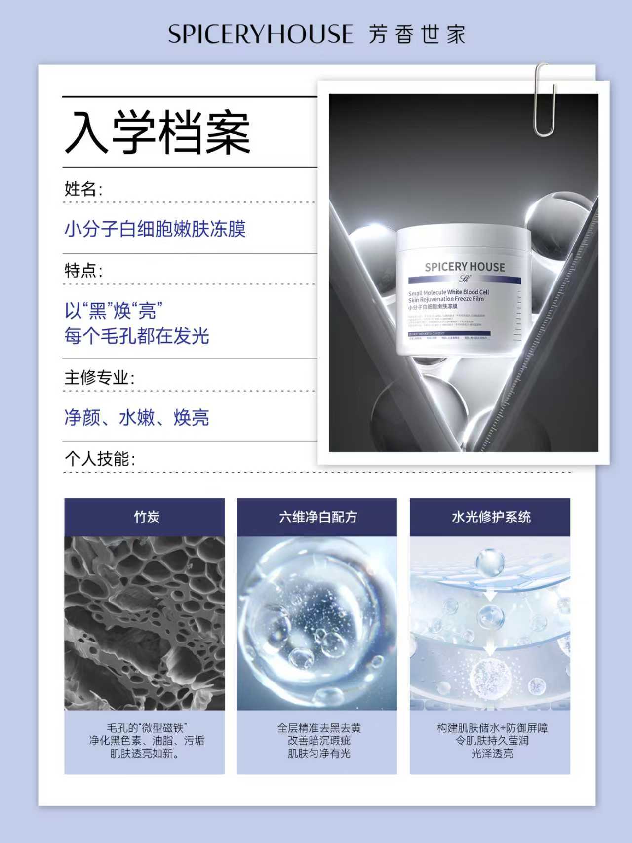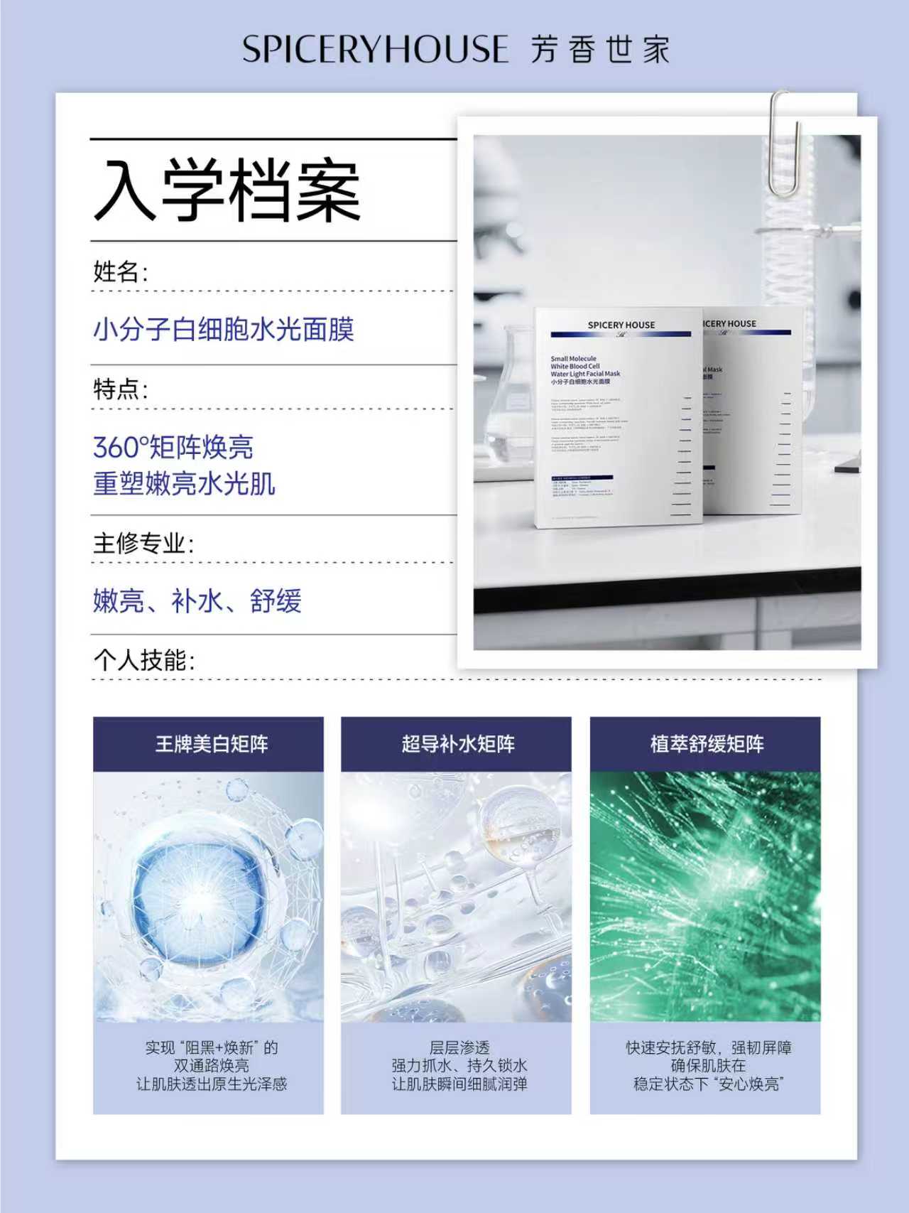 谁不渴望一张自带光泽感的嫩亮肌肤?可现实中,熬夜后的蜡黄倦容、紫外线导致的暗沉色斑、换季时的干燥无光,让“水光肌”成为遥不可及的梦想。试过无数美白面膜,要么是敷完短暂提亮、隔天打回原形的“表面功夫”,要么是成分刺激引发泛红敏感的“得不偿失”。直到芳香世家SpiceryHouse小分子白细胞水光面膜登场,以独创的360°矩阵焕亮体系,打破传统美白面膜的局限,从肌底开启全方位焕亮修护,让每一次敷膜都成为肌肤的“光感重生”之旅。
