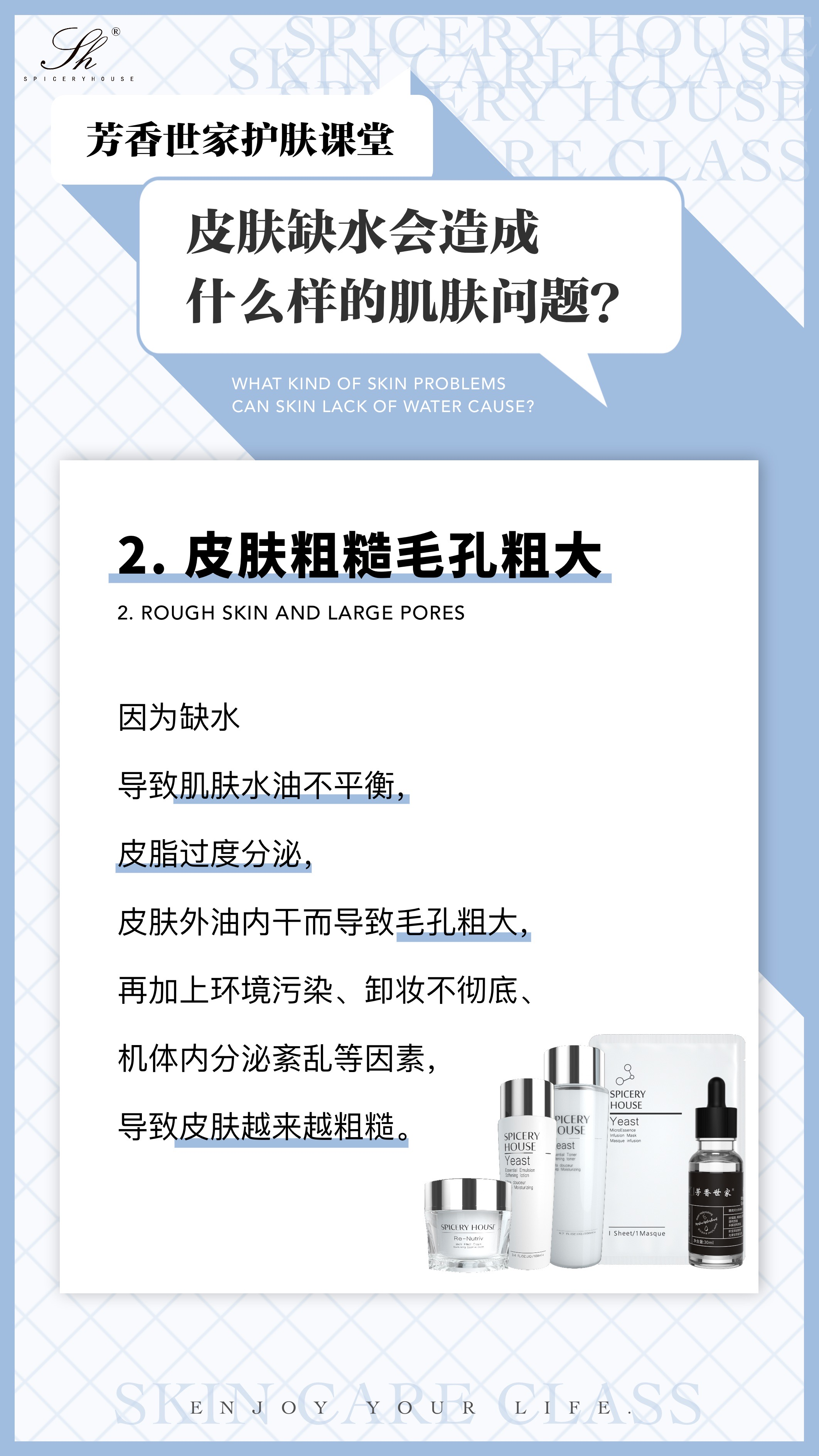 针对缺水引发的皮肤粗糙、毛孔粗大,芳香世家(SpiceryHouse)以 “补水 + 修护 + 紧致” 为核心逻辑,推出多款针对性产品,从根源改善肌肤质感,收缩毛孔。