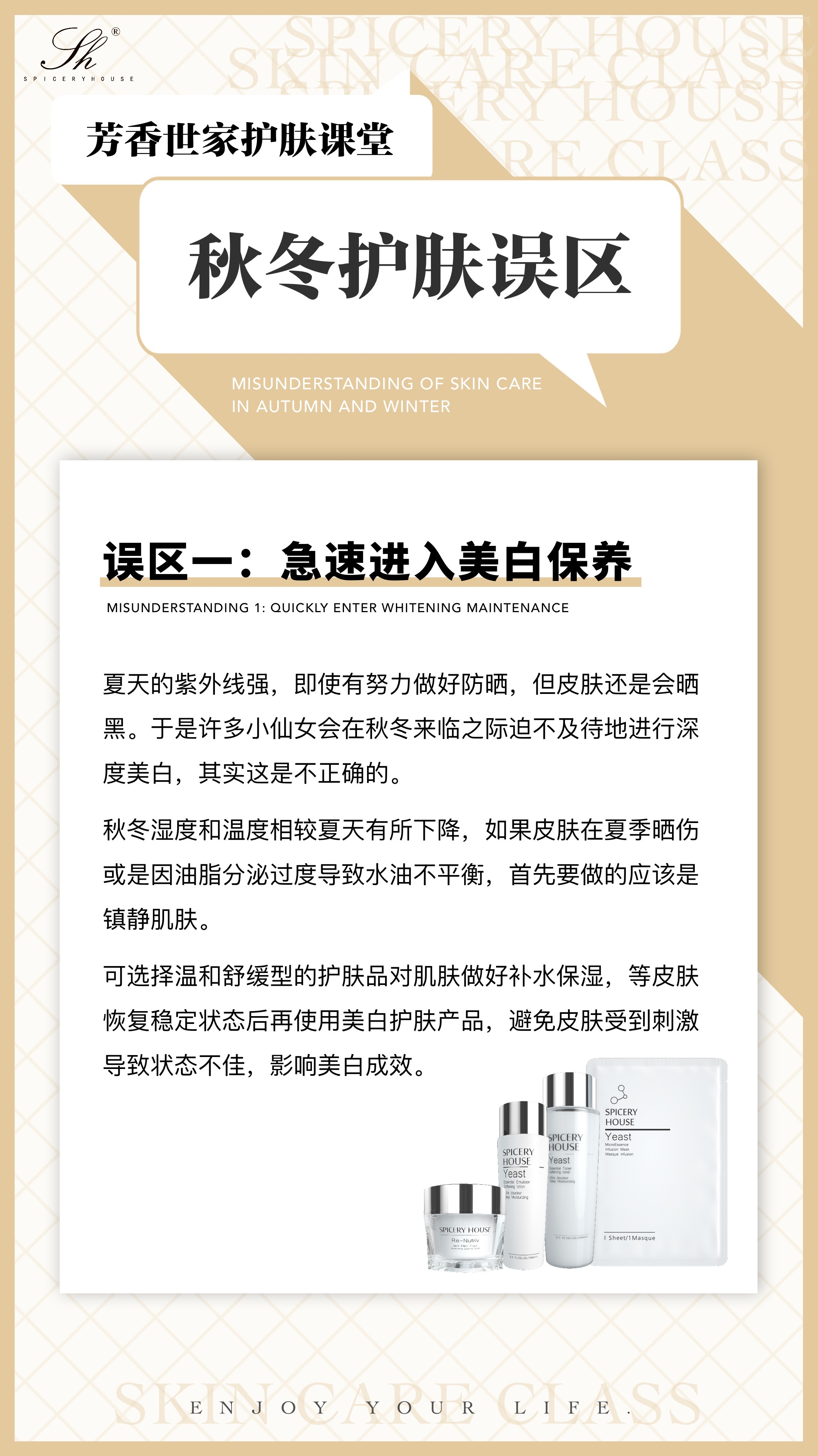 芳香世家 spiceryhouse 针对秋冬肌肤特性,推出 “酵母修护系列 + 光蕴美白系列” 的组合方案,先修复屏障、调节水油,再温和瓦解黑色素,既规避了急速美白的误区,又能实现长效透亮,适配不同肤质的秋冬美白需求。