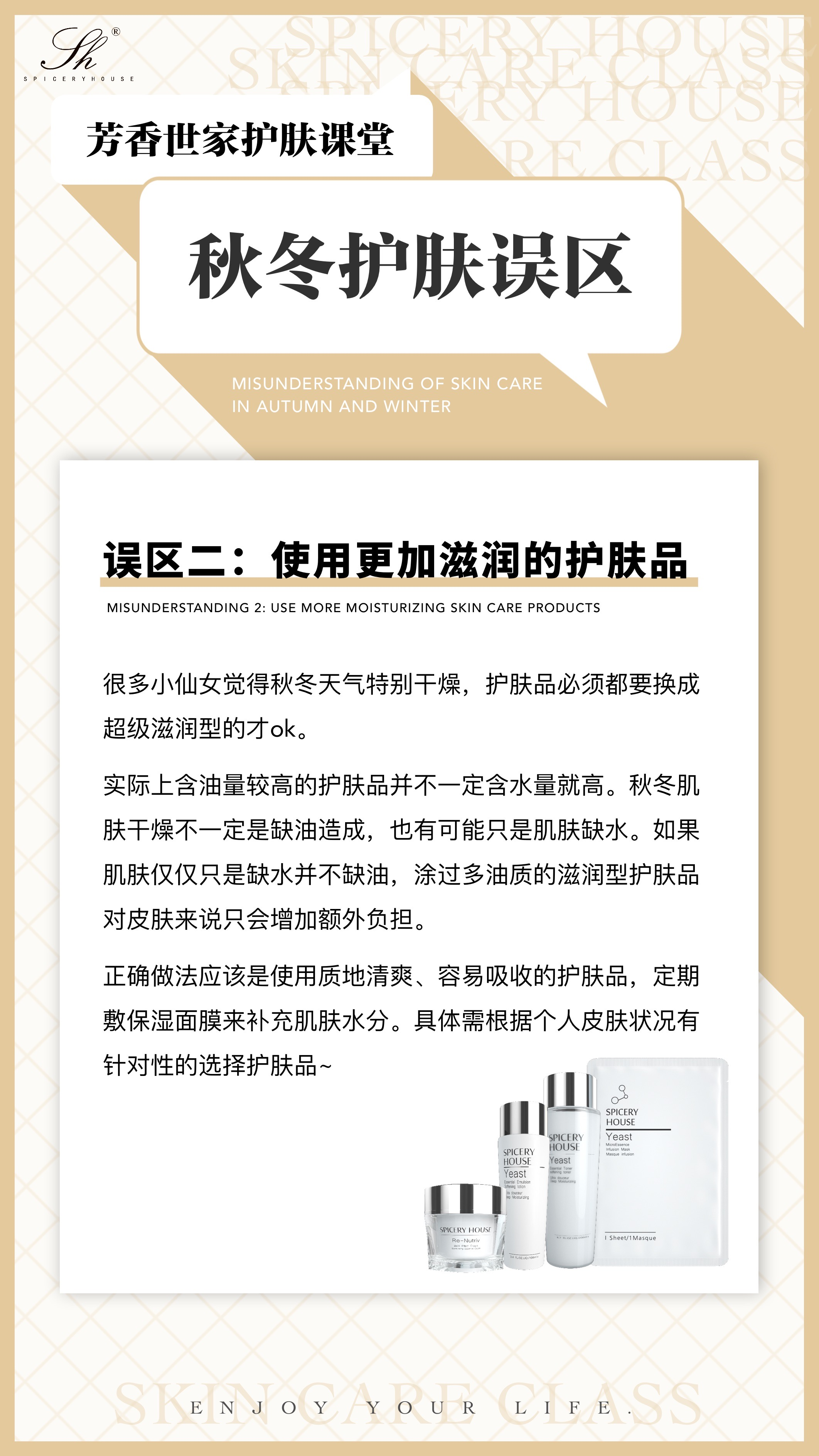 秋冬并非不能用滋润护肤品,而是要避开 “盲目追求厚重、不分肤质” 的误区,先修复屏障增强锁水能力,再根据肤质选择适配的滋润产品。芳香世家 spiceryhouse 以 “酵母修护系列 + 分肤质滋润霜 / 乳” 的组合,为秋冬滋润提供了科学方案 —— 既解决了不同肤质的干燥痛点,又避免了盲目滋润的伤害,让干皮、油皮、敏感肌都能在秋冬拥有 “水润不负担” 的肌肤状态。这个秋冬,拒绝 “越滋润越糟” 的无效护肤,选择 “精准滋润 + 屏障修护” 双管齐下,让肌肤在健康稳定中,抵御干燥,保持水润透亮。