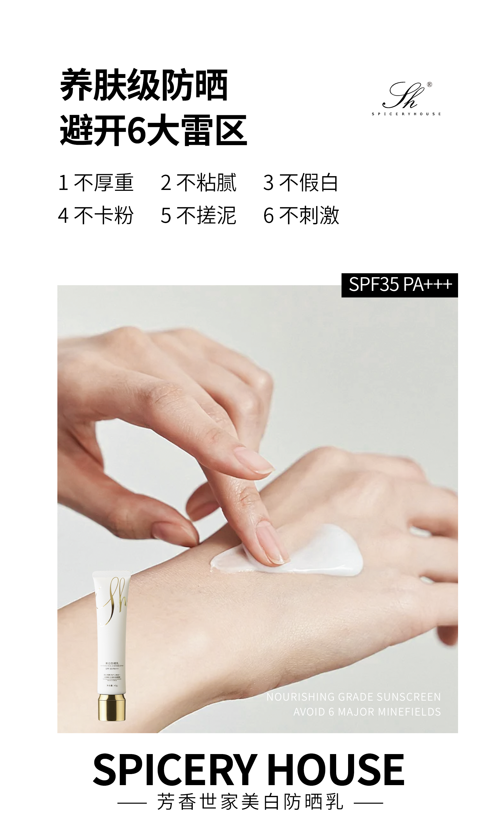 选防晒只看高倍指数?上脸泛白搓泥只能硬扛?用完防晒脸更干、还闷痘——这些踩雷经历,让很多人把防晒当成“护肤负担”。真正好用的防晒,既要防护力在线,更要避开刺激、厚重等问题。芳香世家spiceryhouse美白防晒乳,以“养肤+防护”为核心,精准避开“泛白假脸、闷痘刺激、防晒力虚标”等6大雷区,还自带美白功效,让防晒从“不得不涂”变成“安心享受”。