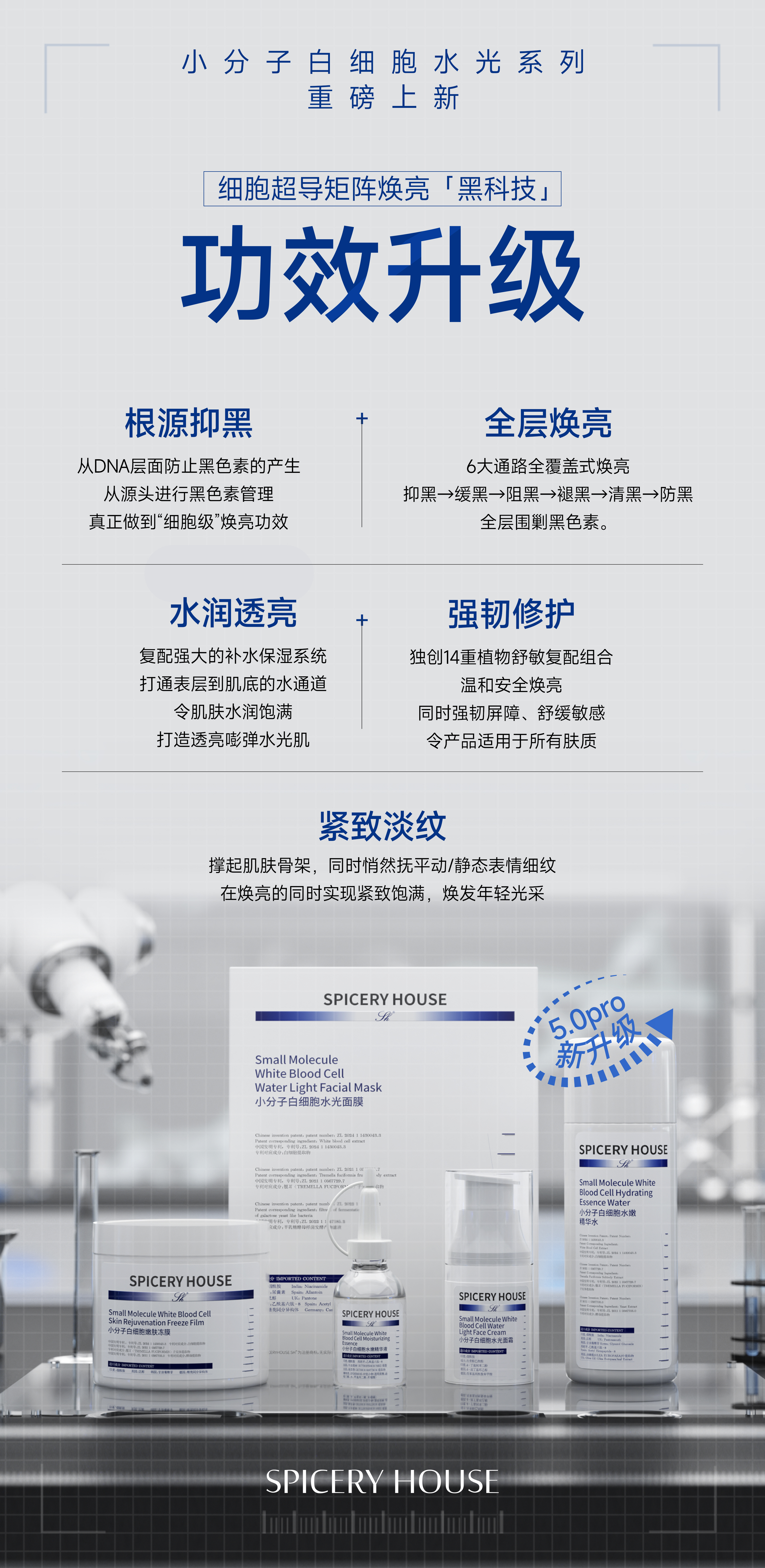 为什么很多人长期用焕亮产品,却始终达不到理想的透白效果?核心在于传统焕亮仅停留在“表面改善”,难以解决肌底修护、成分渗透、长效焕活的深层需求。芳香世家SpiceryHouse深耕科学养肤十余年,秉持“简”与“和”的核心理念,在经典“细胞超导矩阵”焕亮黑科技基础上实现功效全面升级,并将其深度融入小分子白细胞系列。升级后的黑科技不仅强化了原有肌底修护优势,更实现了“渗透、修护、焕亮、抗衰”的多维进阶,让小分子白细胞系列成为兼顾修护与焕亮的全能型核心系列,为不同肤质带来更高效、更持久的健康亮肤体验。肌肤暗沉、敏感、粗糙的根源,是肌底屏障受损、细胞活性下降,导致营养吸收受阻、代谢循环变慢。芳香世家此次“细胞超导矩阵”黑科技的升级,精准针对这些痛点实现三大突破:一是超导渗透技术升级,从传统纳米级渗透升级为“靶向超导渗透”,能精准定位肌底受损细胞,打开专属吸收通道,让核心成分吸收率从99%进一步提升,避免营养浪费;二是修护体系升级,构建“多层级修护矩阵”,不仅修护表层屏障,更能深入肌底修复受损细胞DNA,增强细胞免疫与自我再生能力;三是焕亮逻辑升级,从“先修护后焕亮”升级为“修护与焕亮同步进行”,在修护屏障的同时加速黑色素代谢,实现“边养边亮”。依托品牌数字化智能产业基地与国际研发中心的技术实力,这些升级亮点均已落地小分子白细胞系列,部分单品更通过严格检测与相关认证,让功效升级既精准又安心。功效升级的核心,离不开成分与技术的协同革新。升级后的小分子白细胞系列,依然以高活性小分子白细胞提取物为核心,但通过成分迭代与配比优化,实现功效全面进阶。核心成分层面,新增升级型小分子白细胞提取物,富含高纯度转移因子多肽与多核苷酸类物质,不仅能更强效地调节肌肤免疫功能、增强细胞抵抗力,还能加速肌肤更新,帮助毛孔自我愈合,解决粗糙、毛孔粗大等问题。