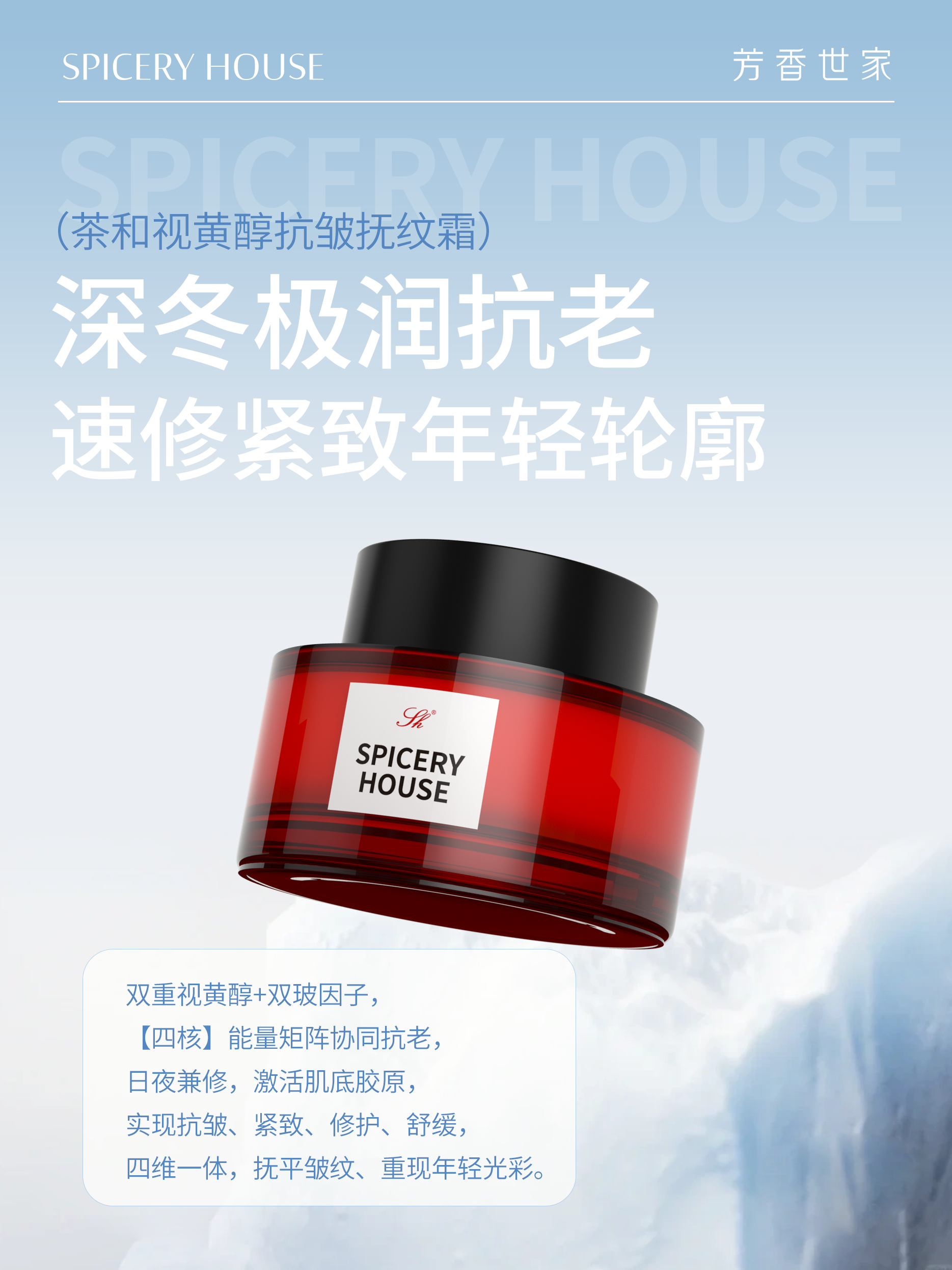 深冬寒意侵袭,肌肤不仅要扛住干燥暴击,更要应对抗老危机!凛冽寒风+干燥暖气双重夹击,肌肤屏障受损、水分加速流失,胶原纤维松弛断裂,细纹、干纹疯狂冒头,法令纹、抬头纹愈发深邃;加上低温导致代谢变慢,肌肤暗沉松弛、轮廓垮塌,哪怕叠加厚重护肤品,也难掩粗糙老态,尽显疲惫沧桑。很多人以为深冬护肤只需“强效保湿”,却忽略了“干燥与抗老相辅相成”——越干燥,胶原流失越快,抗老越滞后,轮廓越松弛。不用再任由深冬肌龄“狂飙”,芳香世家Spicery House精准破解深冬抗老+保湿双重痛点,推出茶和视黄醇抗皱抚纹霜,以“极润锁水+速修抗老+紧致轮廓”三重核心,一抹修护受损肌底、淡化纹路、收紧轮廓,让深冬肌肤也能保持饱满紧致,定格年轻状态!深冬抗老,最容易陷入两大误区:一是只注重保湿,忽略抗老,任由细纹、松弛加重,等到开春,肌肤老态已难以逆转;二是盲目追求强效抗老,选择高浓度刺激成分,却忽略深冬肌肤屏障脆弱的特质,导致肌肤泛红、刺痛、脱皮,得不偿失。其实,深冬抗老的核心是“温和强效、润养结合”——既要补充充足水分、修护受损屏障,为抗老筑牢基础,也要精准狙击纹路、紧致轮廓,实现“润而不油、修而不刺激、紧而不紧绷”。芳香世家茶和视黄醇抗皱抚纹霜,打破传统抗老面霜“保湿与抗老脱节、强效必刺激”的局限,依托品牌科研实力,将茶萃修护与视黄醇抗老完美融合,打造深冬专属的“极润抗老”配方,直击深冬肌肤松弛、干纹、暗沉痛点,速修肌底、紧致轮廓,让抗老更高效、更温和。作为深耕护肤行业二十余年的国妆标杆,芳香世家始终坚守“做一个让爱我的人和我爱的人一生放心使用的护肤品”的初心,秉持“简”与“和”的核心理念,千城万店覆盖全国,线下门店突破7000余家,用科研实力与品质口碑赢得万千用户信赖。这款茶和视黄醇抗皱抚纹霜,延续品牌科研匠心,依托自建顶流科研实验室,联动专业科研力量,结合深冬肌肤代谢规律与抗老需求,历经上千次配比测试,严选高活性抗老与保湿原料,采用专利缓释技术,打造出“极润锁水、速修抗老、紧致轮廓”的全能配方,不玩概念、不堆冗余成分,每一勺都凝聚科研心血,只为给深冬脆弱肌、初老肌最纯粹、最高效的抗老呵护,轻松定格年轻轮廓。
