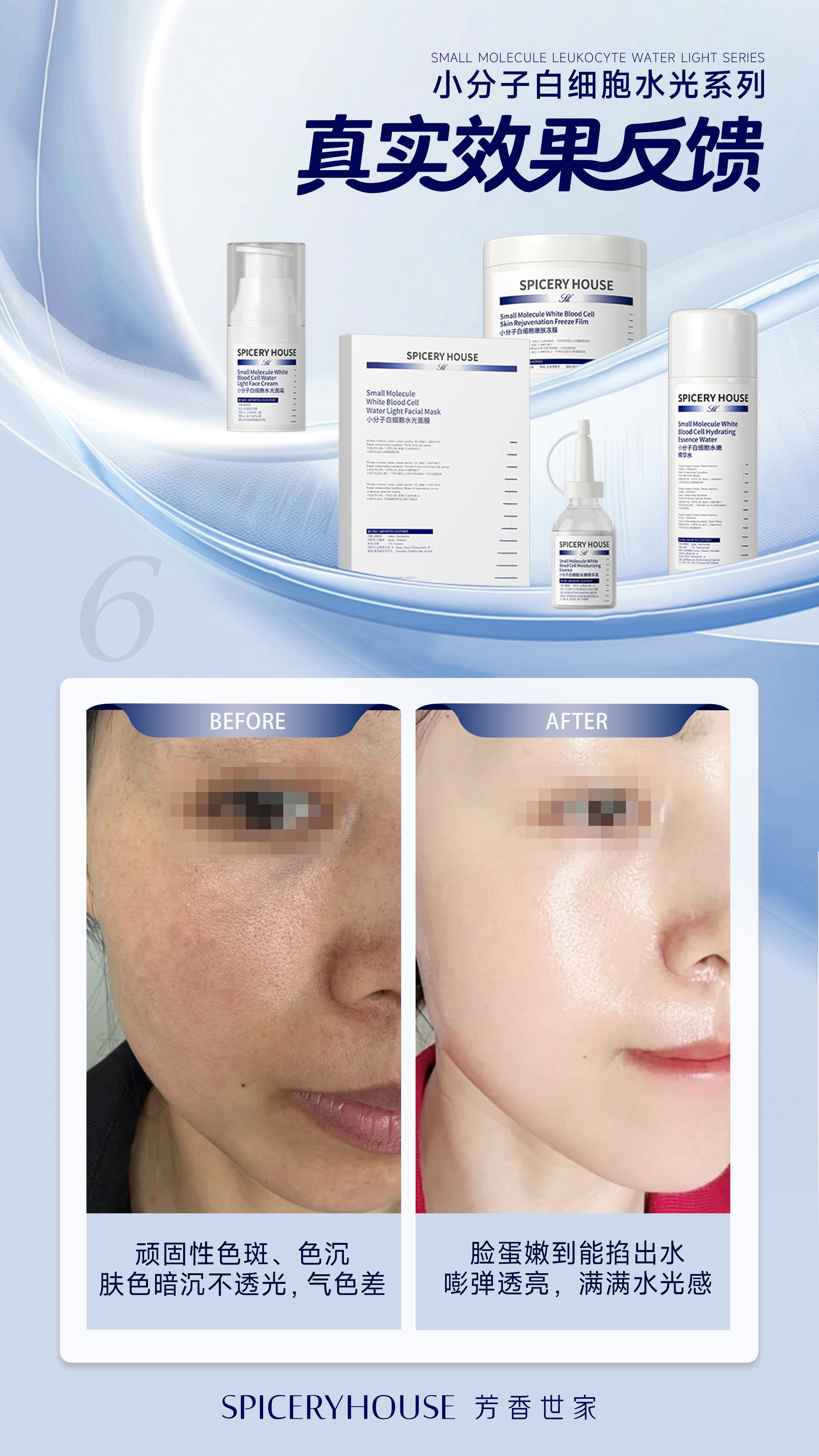 前:顽固性色斑、色沉肤色暗沉不透光,气色差——素颜时整张脸像蒙了一层洗不掉的“灰雾滤镜”,颧骨、眼周、下颌线布满顽固性色斑,深浅交错难掩盖,鼻翼、嘴角泛着成片色沉,连脖颈肤色都比脸颊暗沉一个度;肌肤毫无通透感,摸起来干涩紧绷,没有一丝水润弹性,哪怕喝再多水、敷再多补水面膜,也难掩由内而外的暗沉,整个人看起来疲惫憔悴、毫无精气神,显老又没气色。我们总在追逐嘭弹透亮的水光肌,却试过无数淡斑焕亮、补水护肤品,要么只淡斑不补水,色斑没淡化多少,肤色依旧暗沉干涩;要么只补水不淡斑,皮肤暂时水润,色沉、色斑依旧明显,气色差的问题丝毫没有改善,直到遇见芳香世家SpiceryHouse小分子白细胞水光系列,才真正实现肤质逆袭,最终达成