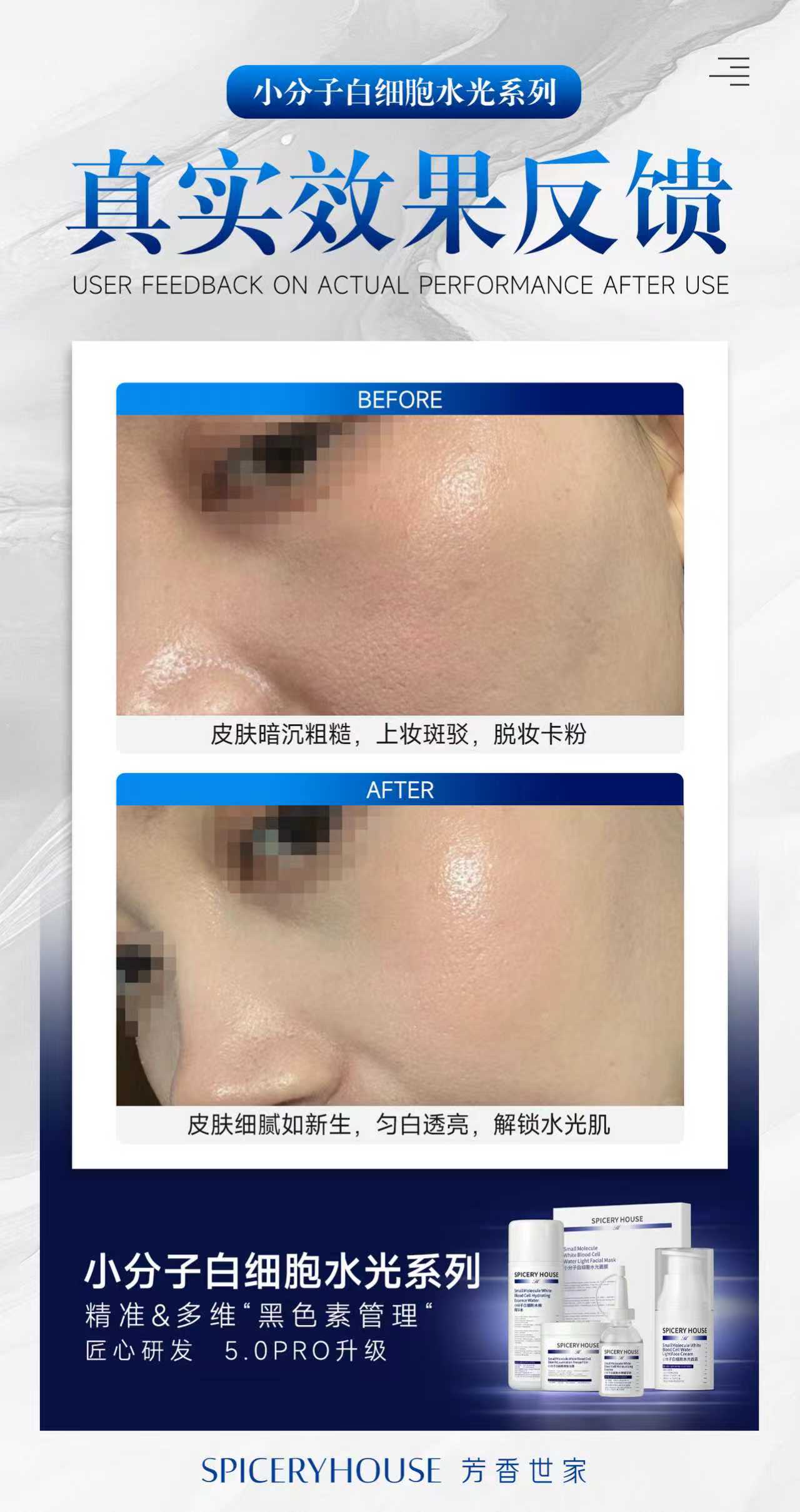 前:皮肤暗沉粗糙,上妆斑驳,脱妆卡粉——素颜时整张脸暗沉无光,像蒙了一层灰蒙蒙的滤镜,摸起来粗糙干涩,毛孔粗大显眼,鼻翼、额头的老废角质泛着颗粒感,轻轻一搓就有起皮碎屑;最让人崩溃的是上妆时刻,粉底难推开、不服帖,脸颊、鼻翼斑驳卡粉,卡出深深的纹路,像干裂的土地;刚上妆不到2小时,T区就开始出油脱妆,粉底斑驳浮粉,假面感十足,连遮瑕都救不回,补妆只会越补越斑驳,出门约会、上班都格外自卑,哪怕用了昂贵的底妆产品,也难掩粗糙肤质的尴尬。我们总在追逐细腻新生、匀白透亮的水光肌,却试过无数焕肤、补水、嫩肤护肤品,要么只补水不嫩肤,皮肤依旧粗糙,上妆还是卡粉;要么只嫩肤不匀白,皮肤暂时细腻,却依旧暗沉无光,达不到水光肌的通透感,直到遇见芳香世家SpiceryHouse小分子白细胞水光系列,才真正实现肤质逆袭,最终达成