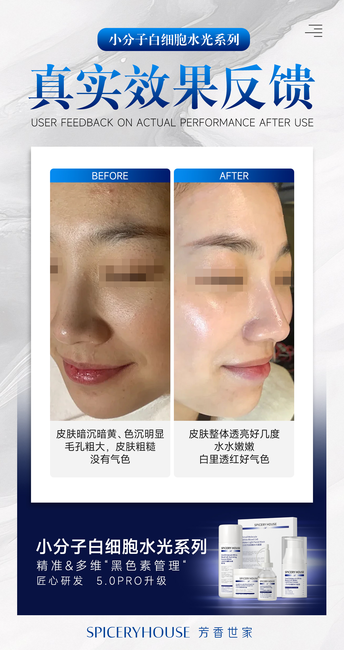 前:皮肤暗沉暗黄、色沉明显,毛孔粗大,皮肤粗糙,没有气色——素颜时整张脸像蒙了一层黄气滤镜,暗沉发灰又泛黄,脸颊、嘴角、眼周的色沉格外显眼,一圈圈暗沉叠加,显得疲惫又显老;毛孔粗大粗糙,鼻翼、额头的毛孔呈椭圆形张开,摸起来干涩粗糙,布满颗粒感,偶尔起皮搓揉还会有碎屑;最让人无奈的是毫无气色,整张脸寡淡无光,哪怕涂了口红,也难掩病态的暗沉,看起来没精神、显憔悴,出门必涂厚重粉底遮瑕,却依旧遮不住底妆下的黄气与粗糙,连自己都忍不住嫌弃这样的肤质。我们总在追逐透亮、水润、白里透红的好气色,却试过无数美白、补水、提亮护肤品,要么只美白不补水,皮肤依旧粗糙没光泽;要么只补水不提亮,皮肤暂时水润,却依旧暗沉暗黄没气色;要么淡化不了色沉,毛孔依旧粗大,直到遇见芳香世家SpiceryHouse小分子白细胞水光系列,才真正实现肤质逆袭,最终达成