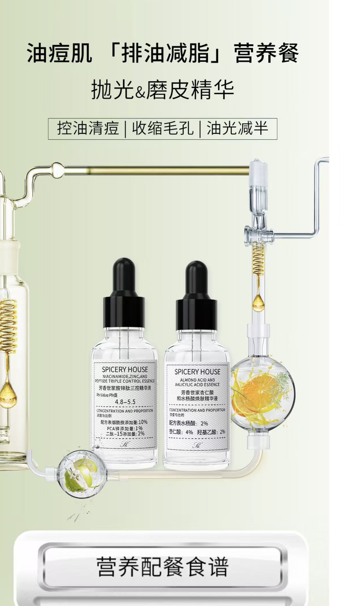对于油痘肌来说,护肤就像给肌肤定制专属营养餐,既要精准“排油减脂”,告别油腻痘肌困扰,又要温和修护、不添负担,拒绝越控越油、越痘越烂的恶性循环。熬夜爆痘、油脂泛滥、毛孔堵塞、闭口粉刺反复、痘印暗沉难消……这些油痘肌的常见难题,根源就在于油脂分泌失衡、毛孔垃圾堆积、肌底炎症反复、老废角质代谢不畅。想要养好油痘肌,盲目控油猛药不可取,温和调理+精准净痘才是王道。芳香世家SPICERYHOUSE专为油痘肌量身打造「排油减脂」护肤方案,两款王牌精华强强联手——胺锌肽三控精华液负责根源控油、维稳修护,杏仁酸和水杨酸焕肤精华液专攻疏通毛孔、净痘淡印,一控一焕,双效协同,给油痘肌喂对“营养餐”,轻松摆脱油腻痘肌,养成清爽哑光、细腻平滑的健康肤质。胺锌肽三控精华液:油痘肌控油维稳主食,根源掐断出油爆痘苗头