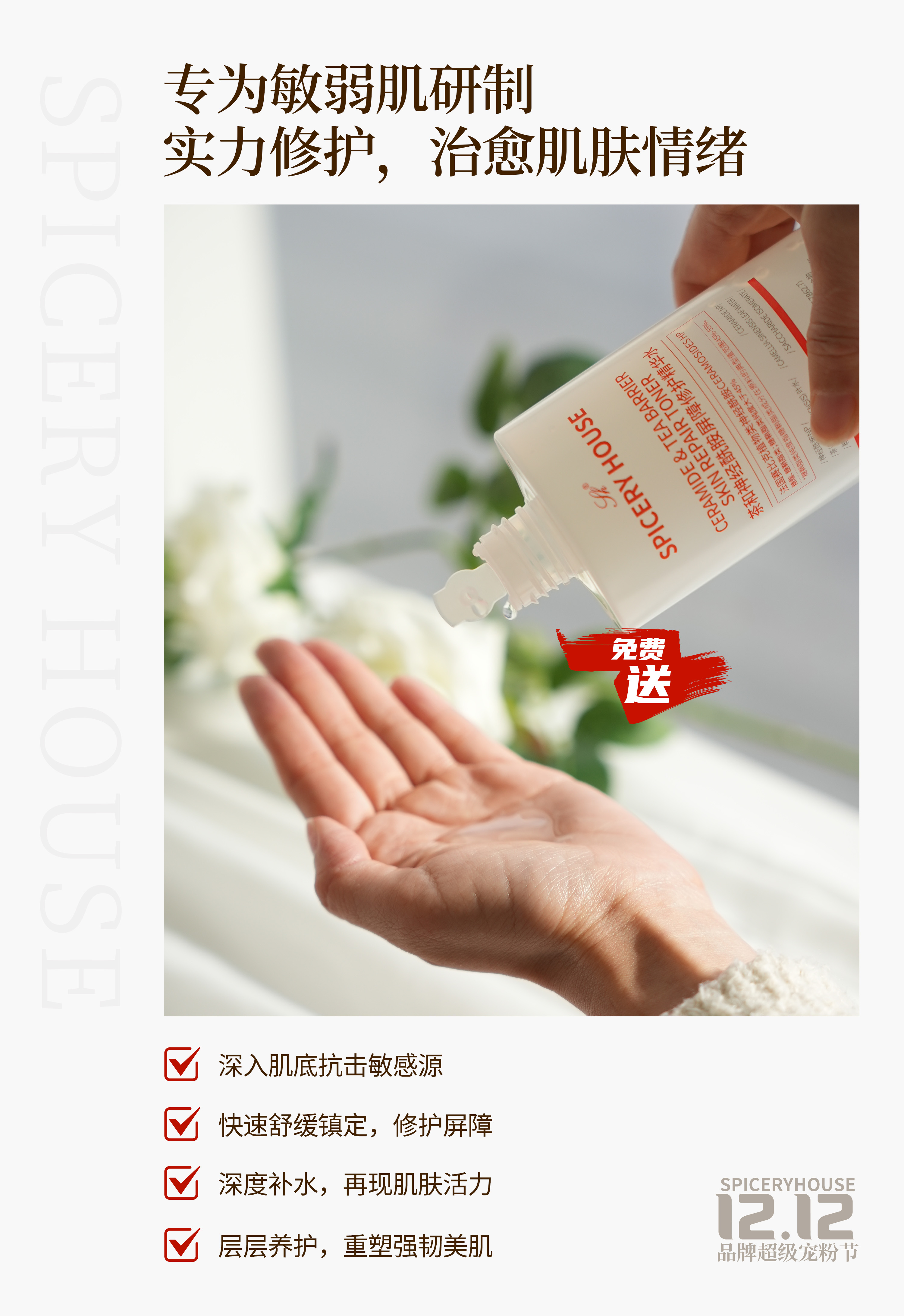 “大红脸”症状反复出现,你的肌肤屏障早已不堪重负需要的是“闪修+厚养”的双重守护泛红终结者“换季就闹脾气,脸颊又红又烫”“熬夜后皮肤紧绷刺痛,像蒙着一层砂纸”“空调房待久了,鼻翼脱屑泛红总不好”——敏弱肌的“小情绪”从不会提前打招呼,泛红、干痒、刺痛等问题一来,不仅影响颜值,更让人心情烦躁。其实,肌肤的这些“坏情绪”,本质是屏障受损发出的求救信号。SPICERY HOUSE芳香世家茶和神经酰胺屏障修护精华水,专为敏弱肌量身定制,用科学修护力安抚肌肤躁动,重建健康屏障。